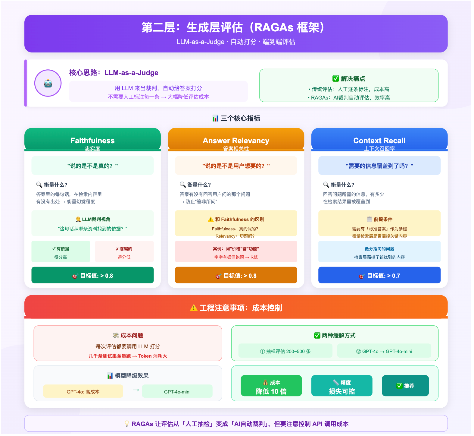 需要注意的是,RAGAs 本质上是「LLM-as-a-Judge」,每次评估都要调用 LLM 来打分。如果测试集有几千条,全量跑一遍的 token 消耗和时间成本相当可观。工程上通常有两种缓解方式:一是对核心测试集抽样评估,只跑最有代表性的 200~500 条;二是把评判者模型从 GPT-4o 降级到 GPT-4o-mini,成本降低 10 倍,精度损失在可接受范围内。