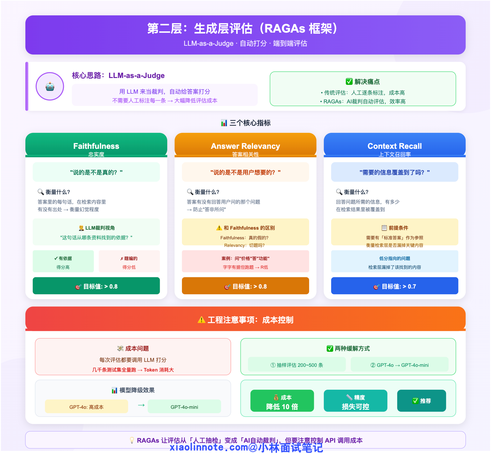 检索层评估回答了「找没找到」的问题,但找到之后 LLM 有没有好好利用这些内容?这就需要生成层评估。RAGAs(RAG Assessment)是目前最常用的 RAG 端到端评估框架,它的核心思路叫做「LLM-as-a-Judge」,意思是用 LLM 来当裁判,自动给答案打分,不需要人工标注每一条,大幅降低评估成本。