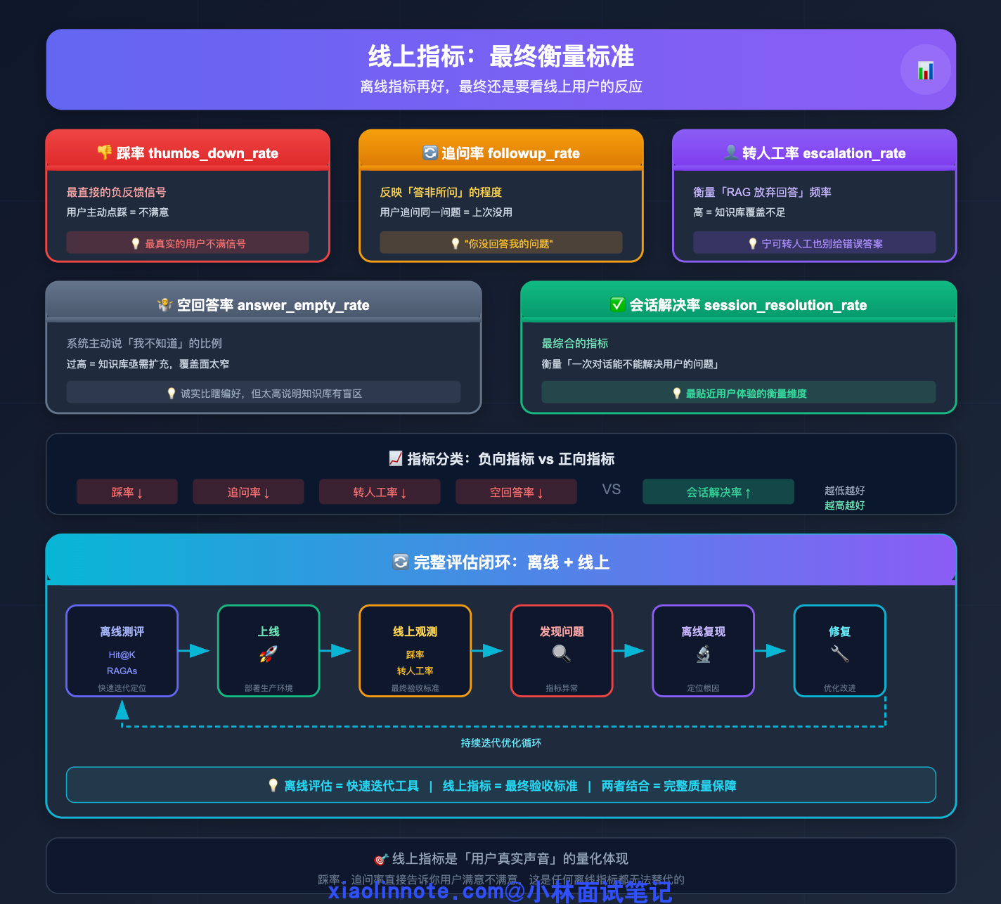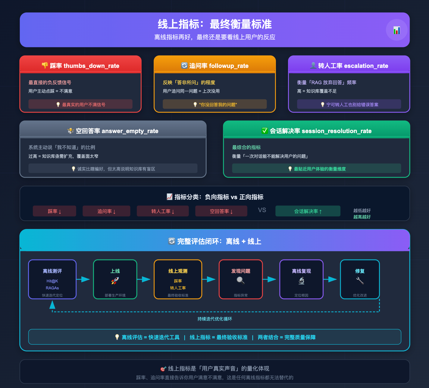 离线评估(Hit@K + RAGAs)用来快速迭代和定位问题,线上指标(踩率、转人工率)是最终验收标准。两者结合,形成「离线测评 -> 上线 -> 线上观测 -> 发现问题 -> 离线复现 -> 修复 -> 再上线」的完整评估闭环。