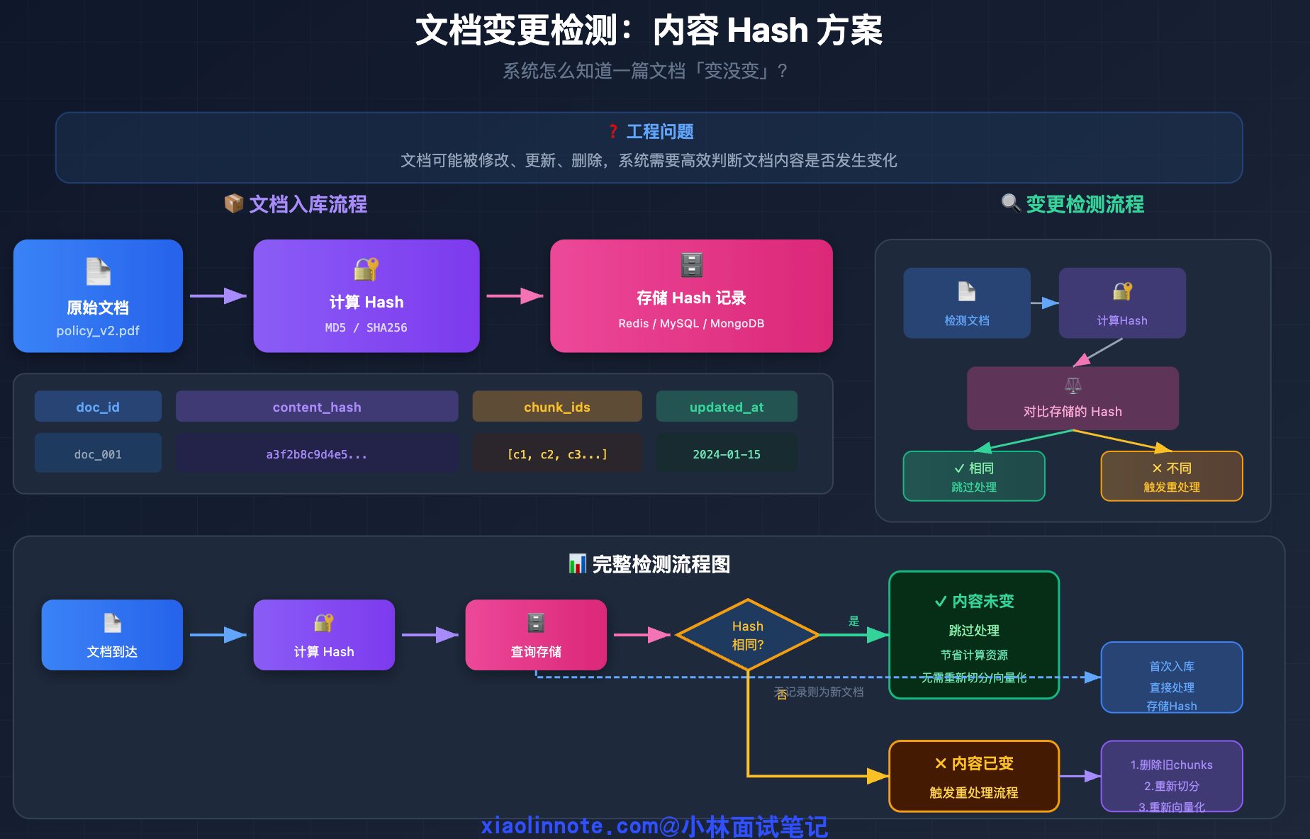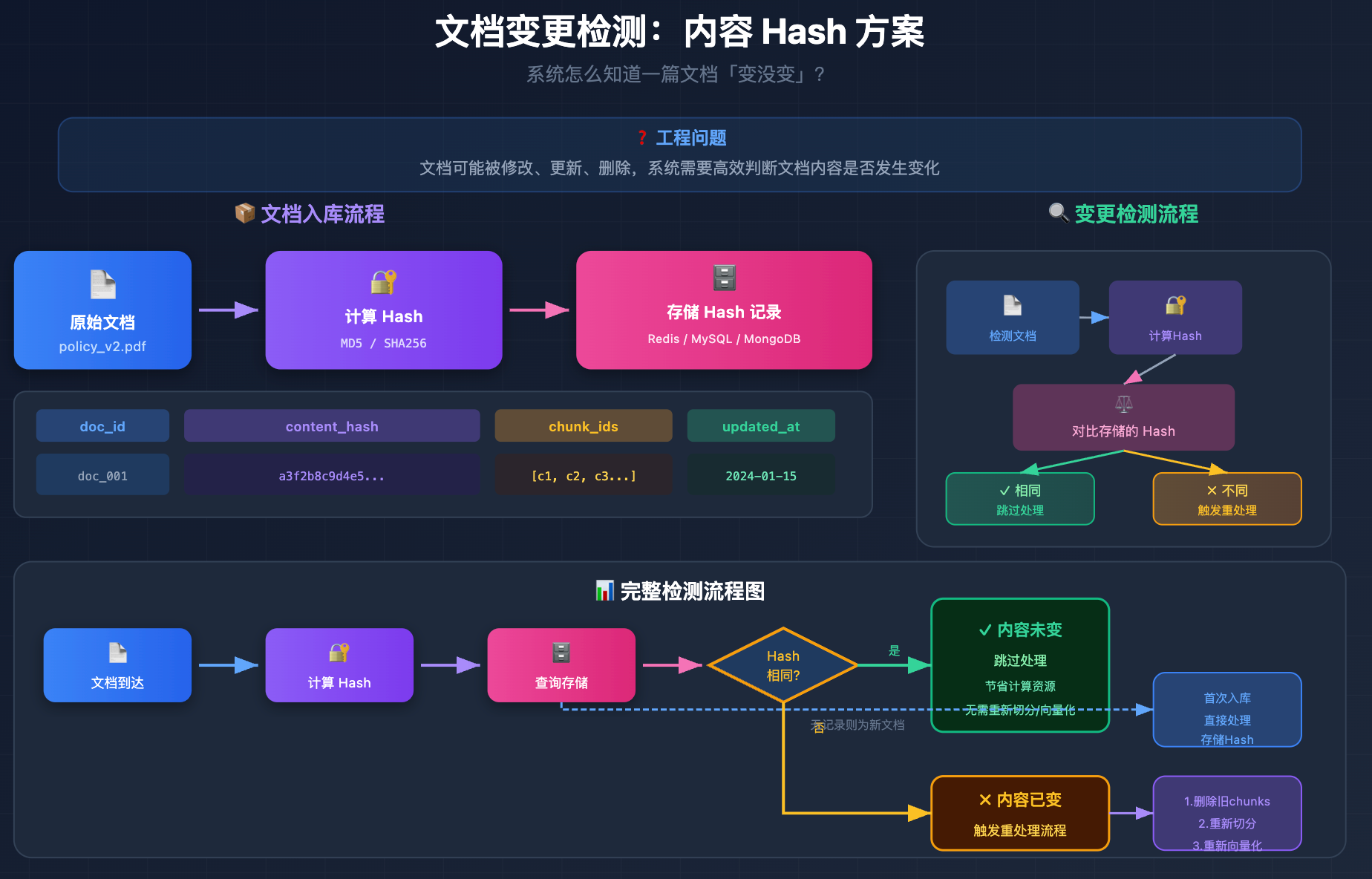 最常用的方案是内容 hash。每次文档入库时,计算文档内容的 MD5 或 SHA256 摘要,把这个 hash 值和文档 ID、对应的 chunk ID 列表一起存下来(存在 Redis、数据库都行)。下次检测到这篇文档时,重新计算 hash 和存储的值对比:相同说明内容没变,跳过;不同说明内容有更新,触发重处理流程。