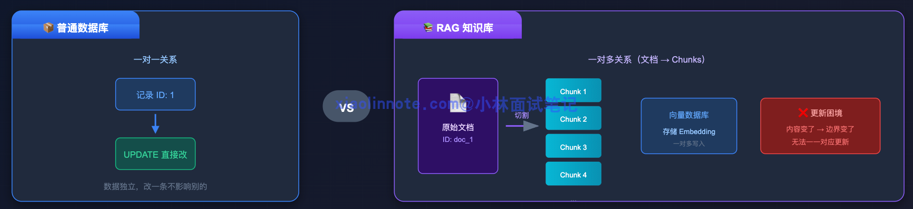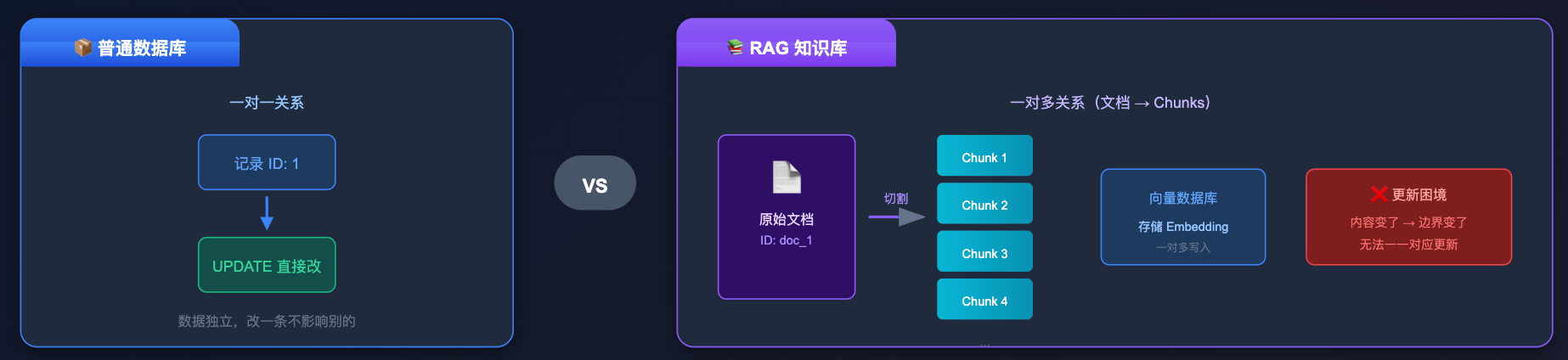 在讲具体方案之前,先搞清楚一个关键问题:为什么 RAG 知识库的更新不能像普通数据库那样直接 UPDATE?原因在于,普通数据库更新一条记录,直接 UPDATE 就行,数据是独立的,改一条不影响别的。但 RAG 知识库的麻烦在于:原始文档和向量库之间不是一对一的关系,而是一对多的关系。