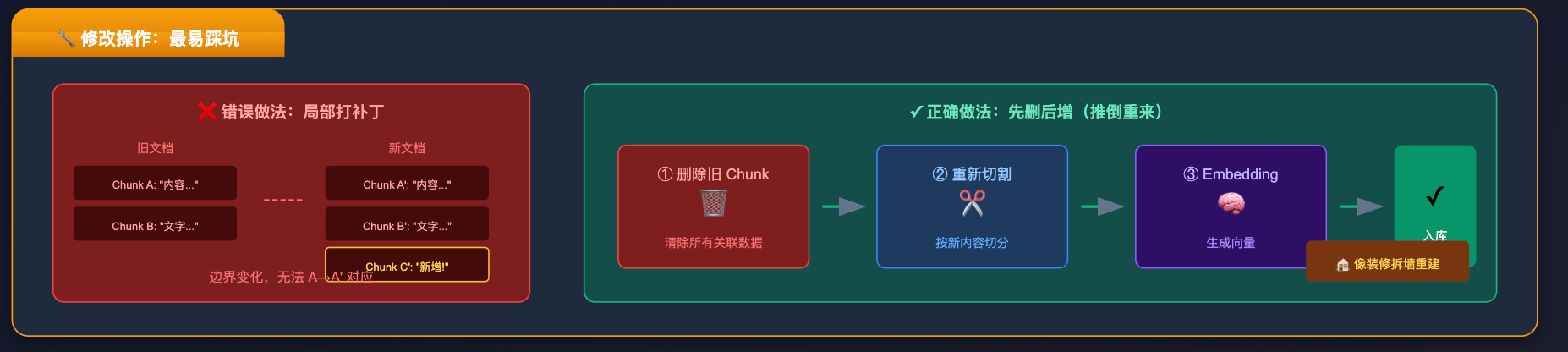 修改是最容易踩坑的操作,值得多说几句。很多同学第一次做这个功能,直觉上认为「只改了一段文字,更新那一个 chunk 就好了」,这个思路在实际中行不通。原因很简单:文档内容一改,切割边界就变了,原来第 3 个 chunk 的内容可能现在分散在第 3 和第 4 个 chunk 里,你根本没法把旧 chunk 和新 chunk 一一对应起来做「局部打补丁」。就像装修时把一堵墙拆了重建,不能指望原来的插座位置还能对上,整面墙的电路要重新布。所以修改的正确做法是推倒重来:把这篇文档之前入库的所有 chunk 全部删掉,然后重新按新内容切割入库。操作虽然暴力,但是可靠,也是唯一不会出 bug 的做法。