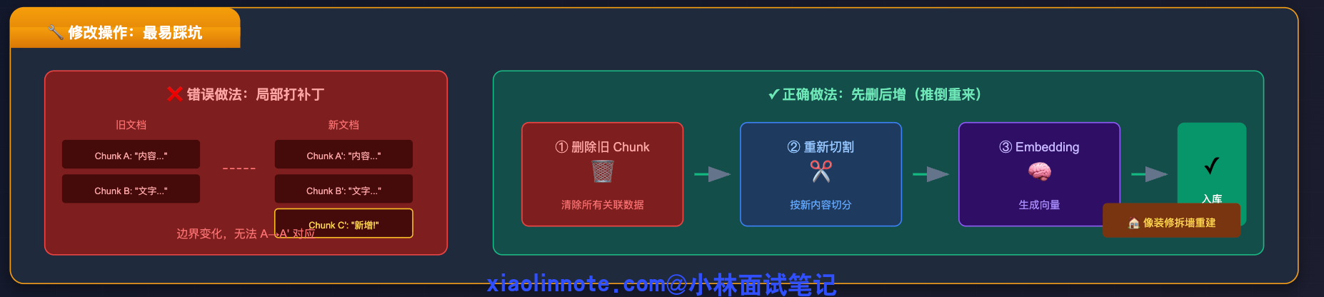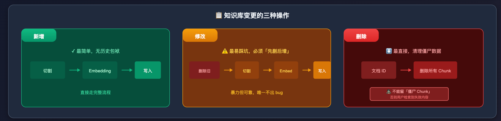 所以 RAG 知识库的更新逻辑必须是先删掉旧文档对应的所有 chunk,再重新切割入库,即「先删后增」,而不是在原来的 chunk 上直接更新向量。