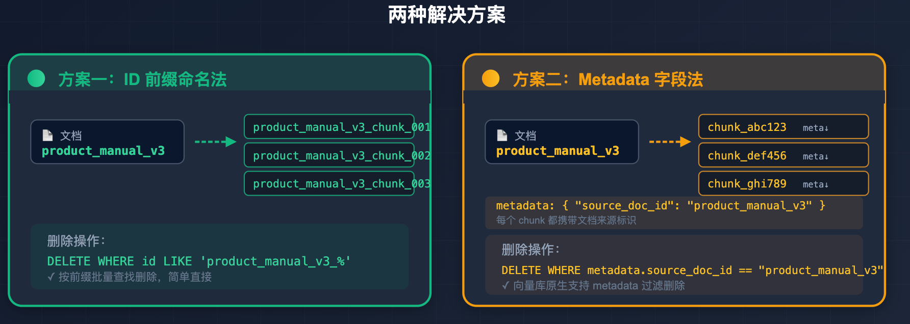另一种做法是在每个 chunk 的 metadata 里存上文档 ID 字段(比如 source_doc_id: "product_manual_v3"),向量库一般都支持按 metadata 字段过滤批量删除,效果是一样的。无论选哪种方式,关键是从一开始就把文档和 chunk 的关联关系设计好,等到需要更新时再临时想办法,会很狼狈。