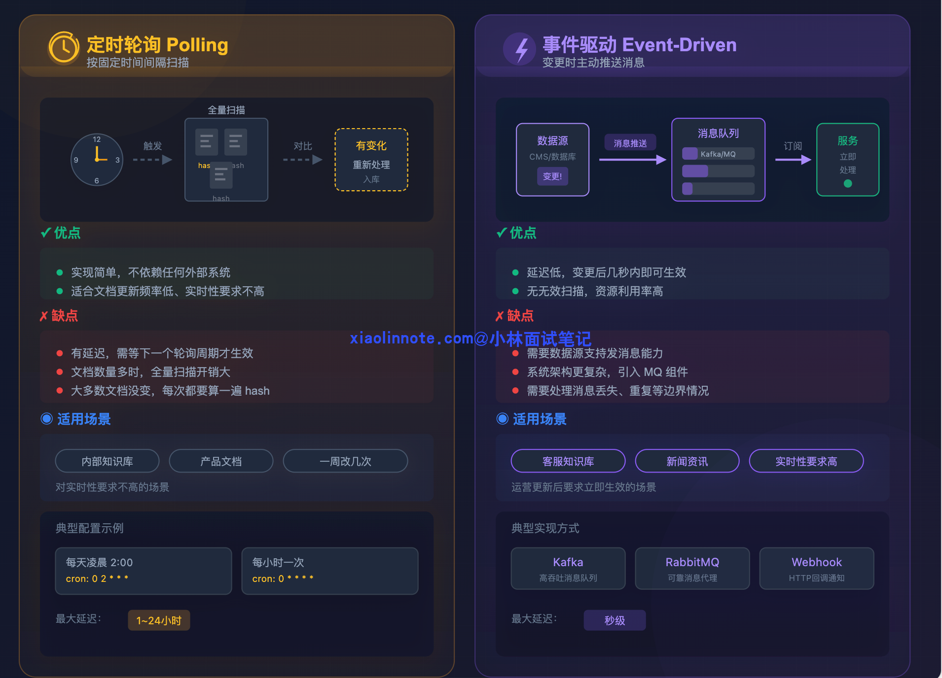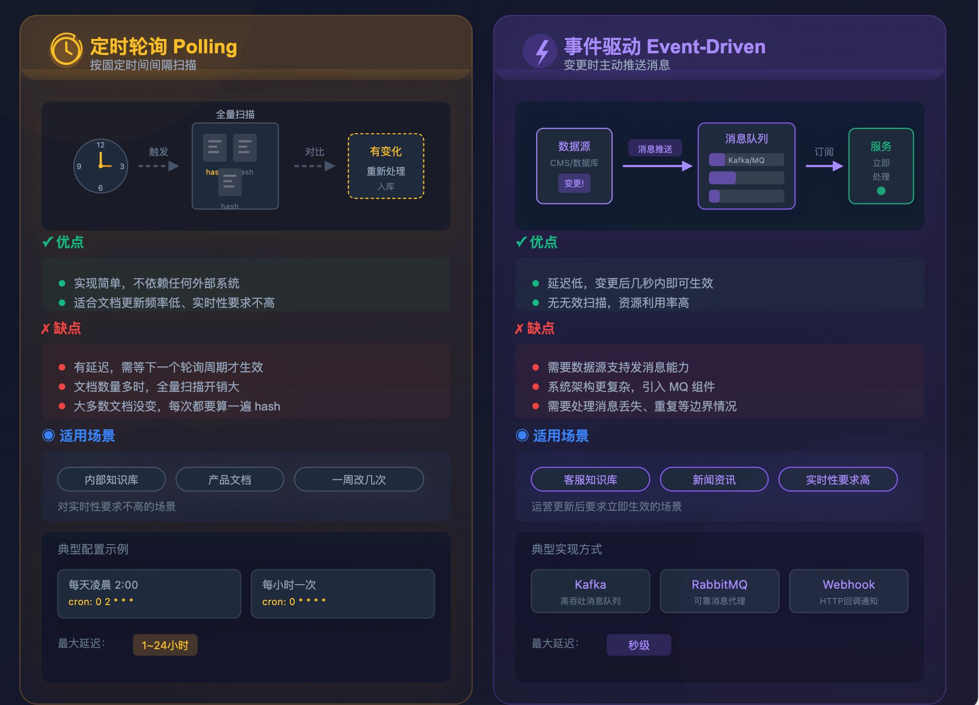 前面说了怎么检测变更(hash)和怎么处理变更(先删后增),那系统怎么在第一时间感知到文档需要更新?有两种主流方案,各有适用场景。