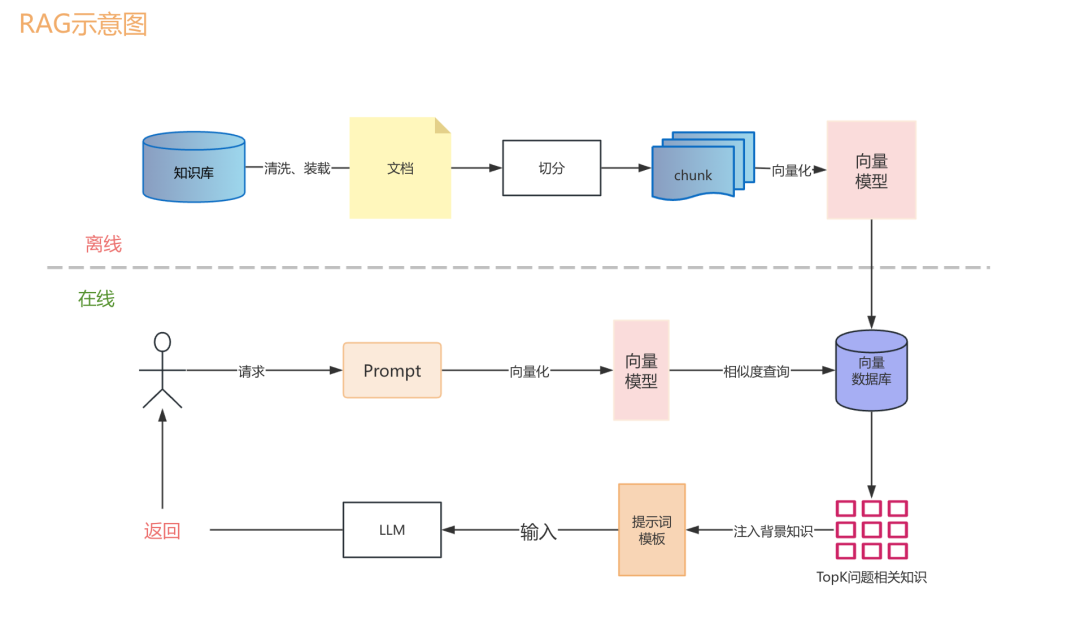 整个流程串起来是这样:离线阶段把文档切割成 chunk,转成向量存进数据库,这一步只做一次;在线阶段每次用户提问时,先把问题向量化,再去数据库里检索,经过精排后拼进 prompt,最终由 LLM 生成答案。两个阶段分工明确,离线负责建库,在线负责检索和生成。