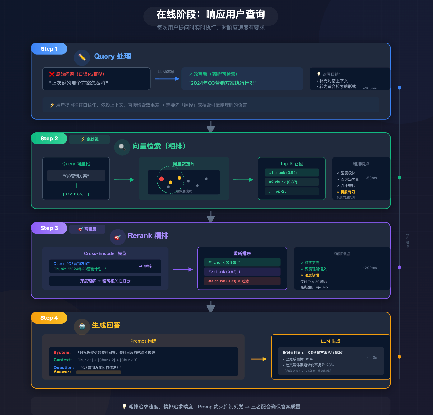 在线阶段是每次用户提问时实时执行的,对响应速度有要求。