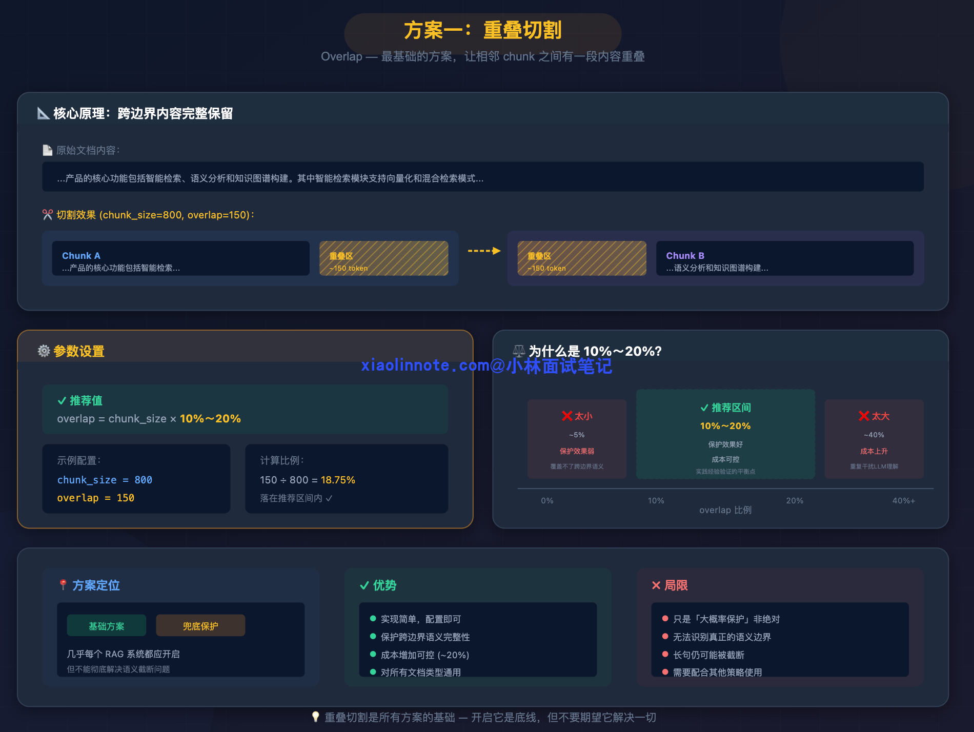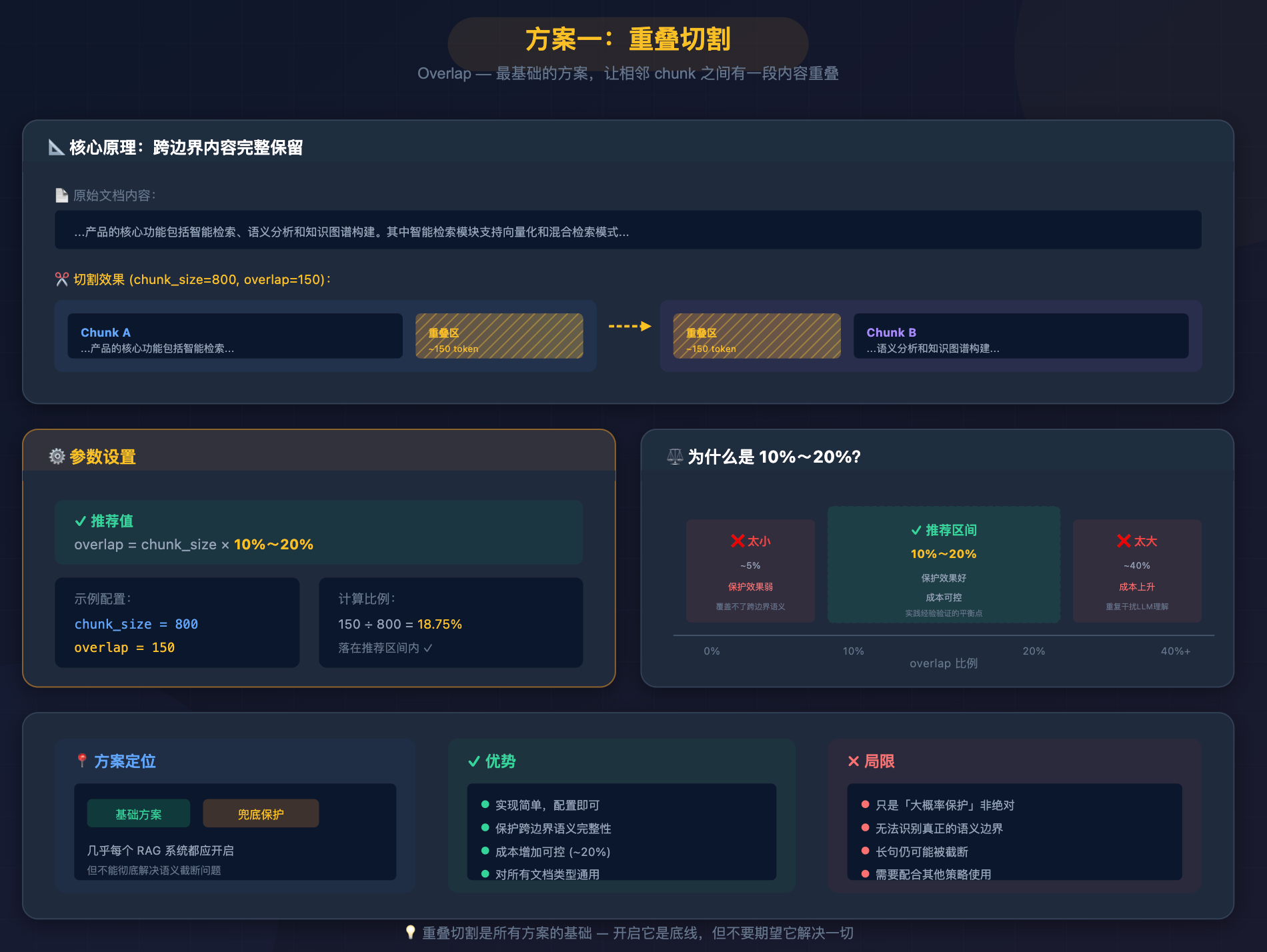 重叠切割是所有方案的基础,几乎每个 RAG 系统都应该开启,但它只是兜底,不能彻底解决语义截断问题。很多人以为加了 overlap 就万事大吉了,其实它只能保证跨边界的文字不丢失,解决不了「一个完整语义被拆散」的根本问题。