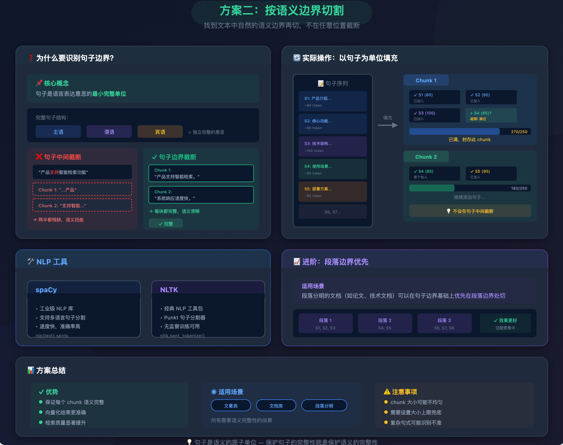 重叠切割既然只是兜底,那能不能在切的时候就更聪明一点,直接避免在语义中间截断?这就是语义边界切割的思路——找到文本中自然的语义边界再切。为什么要识别句子边界?
