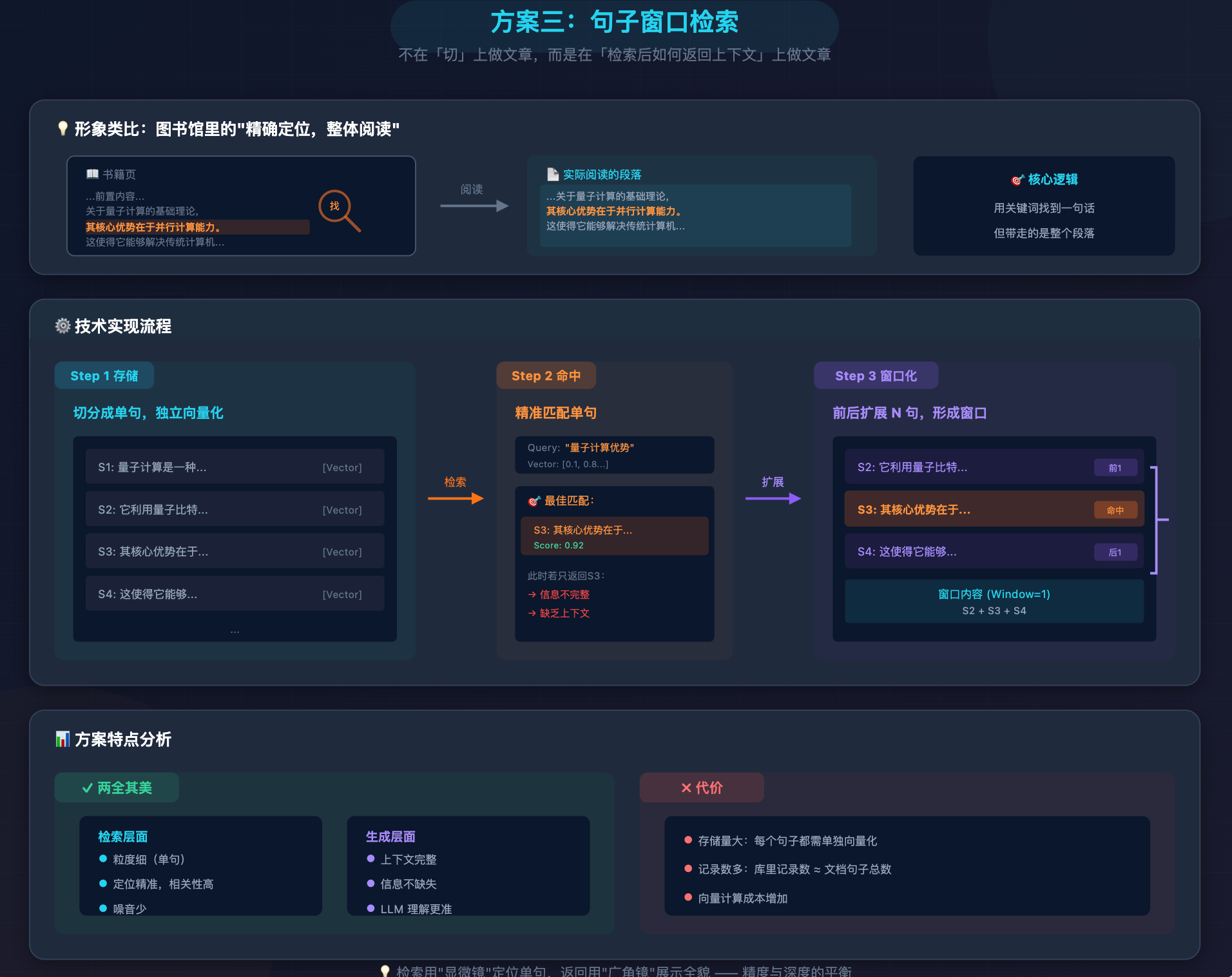 这样的好处是两全其美:检索粒度细(单句),定位准确,相关性高;但给 LLM 的内容是完整的上下文窗口,不会因为检索粒度太细而导致 LLM 拿到的信息不完整。缺点是存储量较大,每个句子都需要单独向量化,库里的记录数等于文档的句子总数。