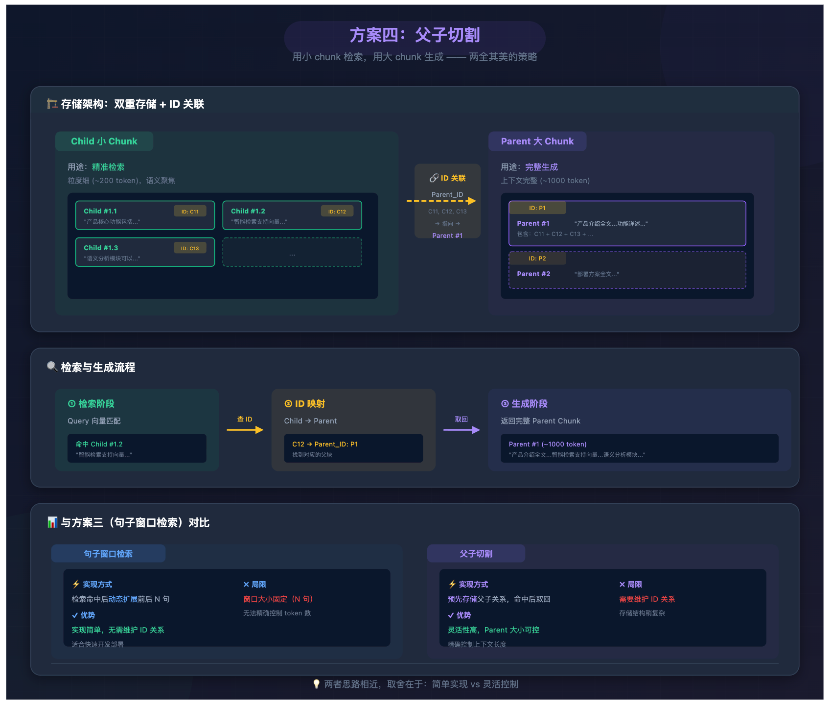 理解了句子窗口检索的「检索命中后动态扩展上下文」思路,父子切割就很好懂了,它是一种更结构化的实现方式。父子切割的思路是「用小 chunk 检索,用大 chunk 生成」:存储时同一段内容存两份,一份是细粒度的小 chunk(比如 200 token),一份是包含这个小 chunk 上下文的大 chunk(比如 1000 token),两者通过 ID 关联。检索时用小 chunk,语义聚焦,召回精度高;命中后把对应的大 chunk 返回给 LLM,上下文更完整,生成质量更好。