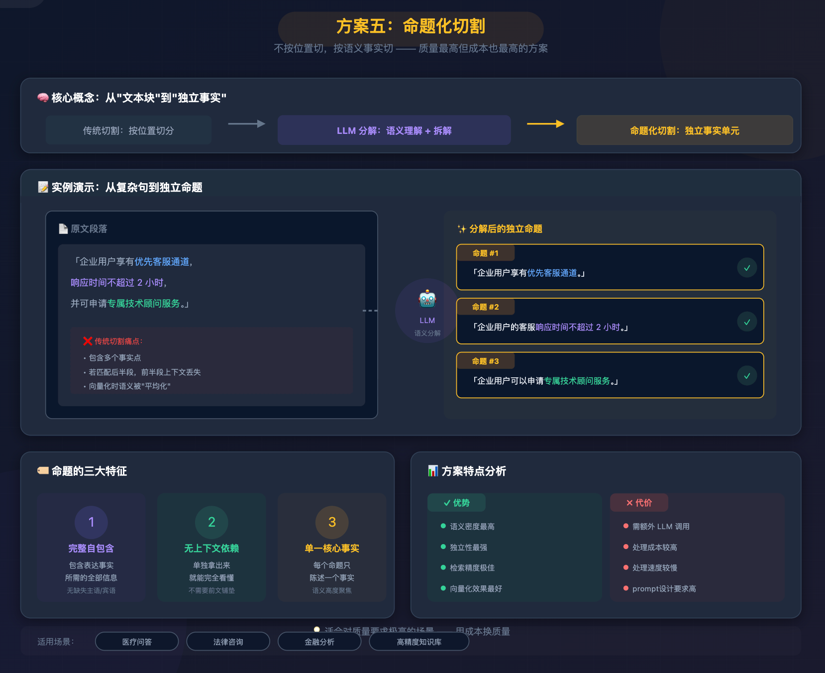 | 命题化切割 | LLM 拆解为独立命题 | 高质量要求、重要知识库 | LLM 调用成本高 |