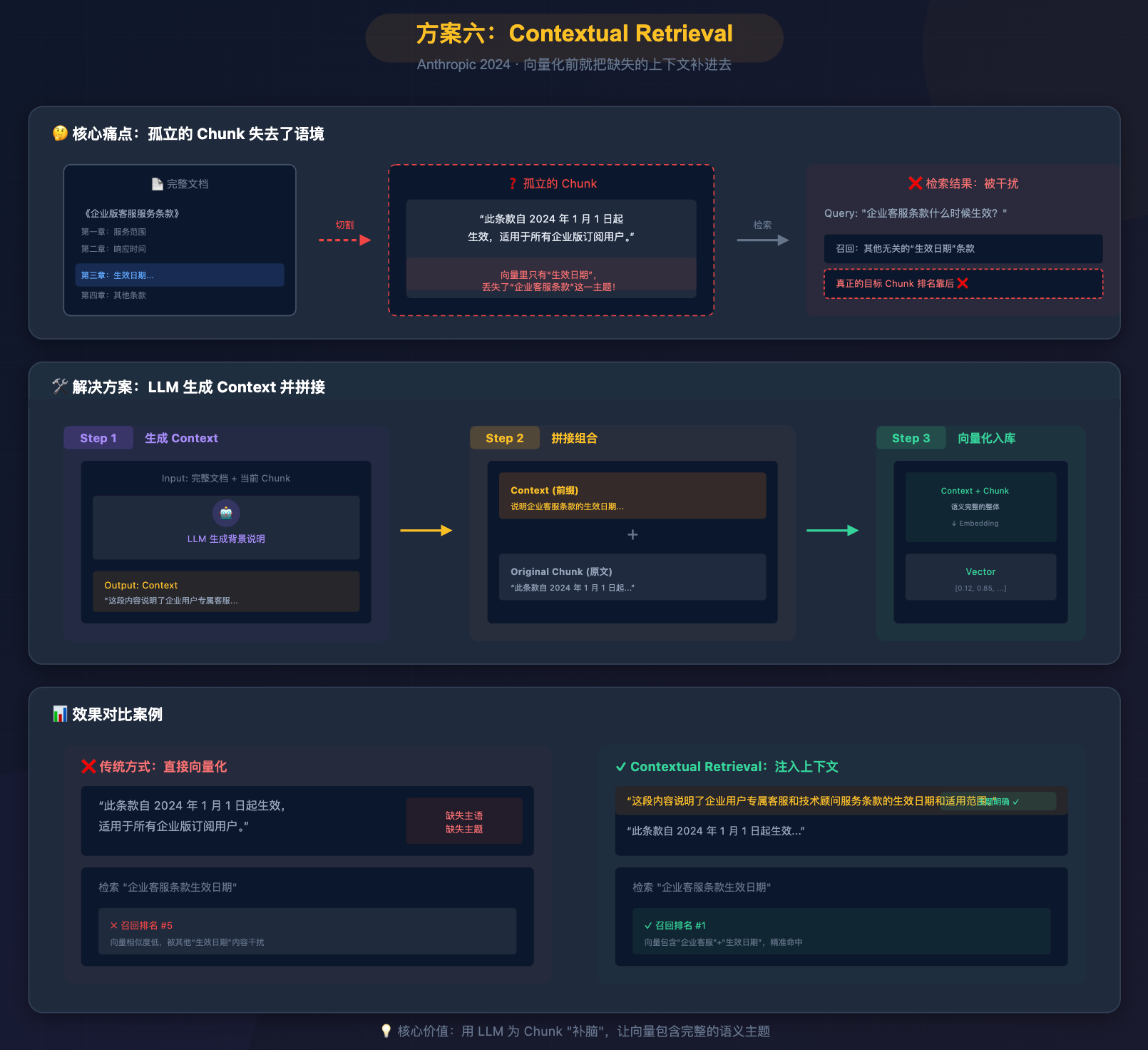 还有一个我觉得比较有价值的方案,是 Anthropic 提出的 Contextual Retrieval,在做 Embedding 之前先让大模型看着整篇文档为每个 chunk 生成一段背景说明,把这段背景和 chunk 拼在一起再向量化,从根本上解决孤立 chunk 没头没尾的问题。