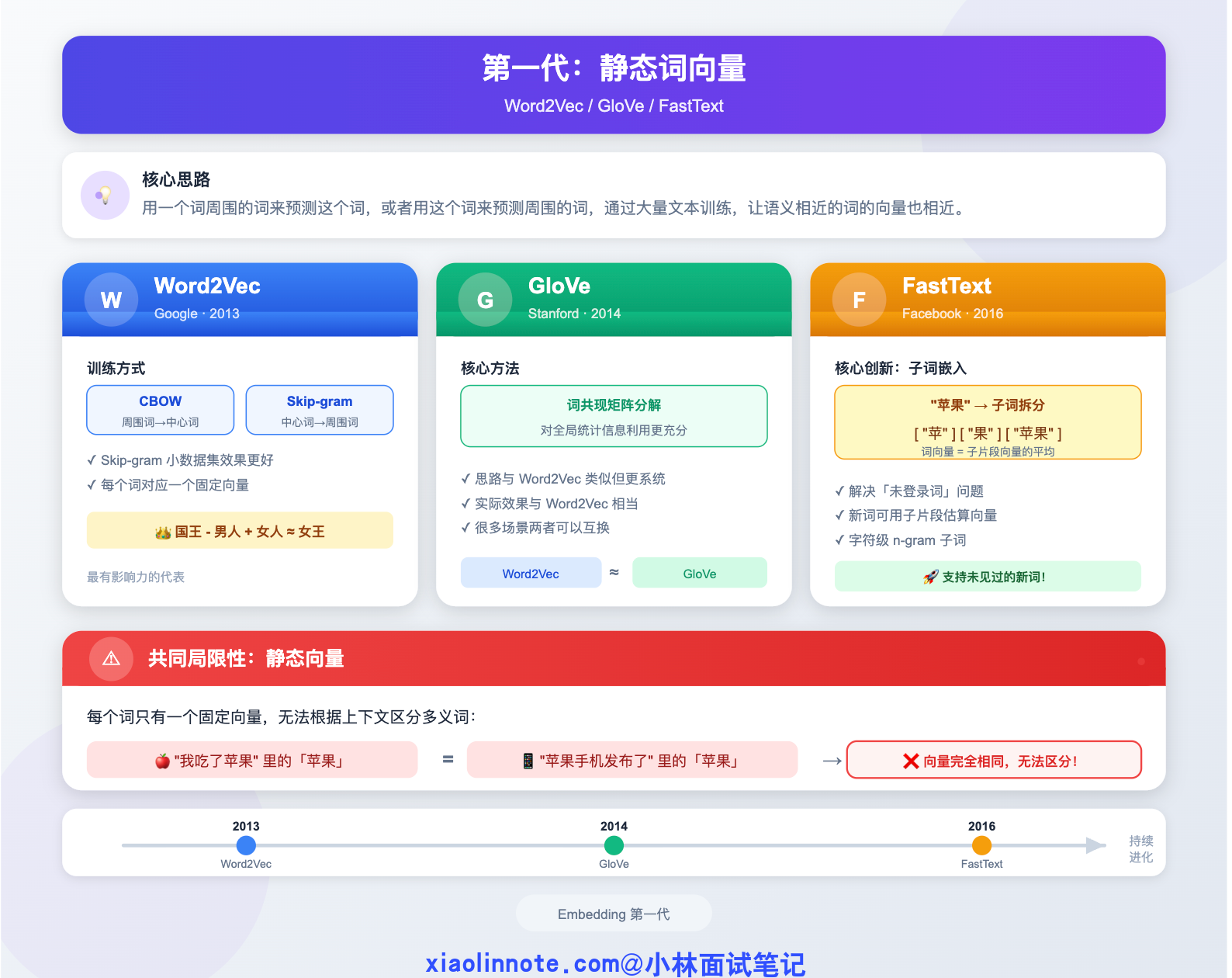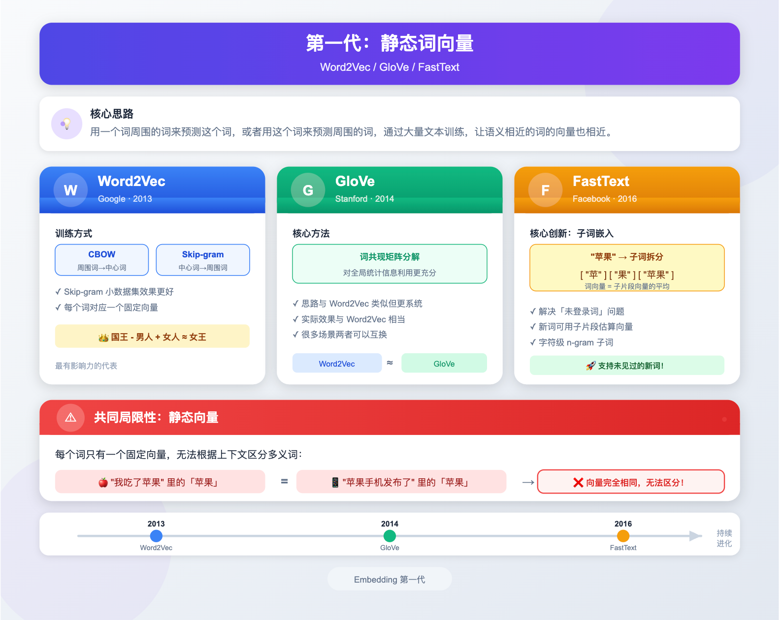 | 第一代 | Word2Vec、GloVe、FastText | 词级静态向量 | 无法处理多义词,词级非句子级 | 不适用 |