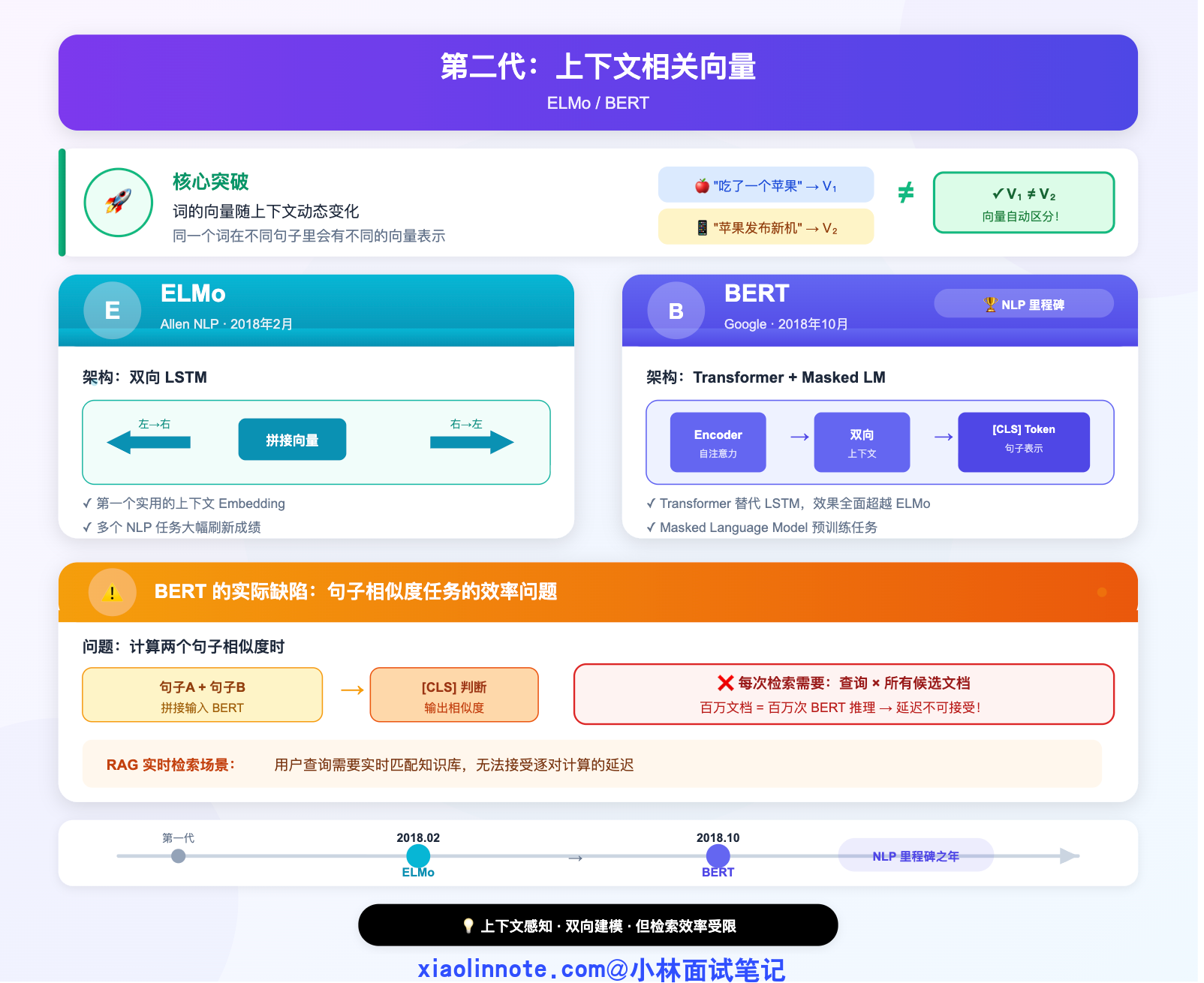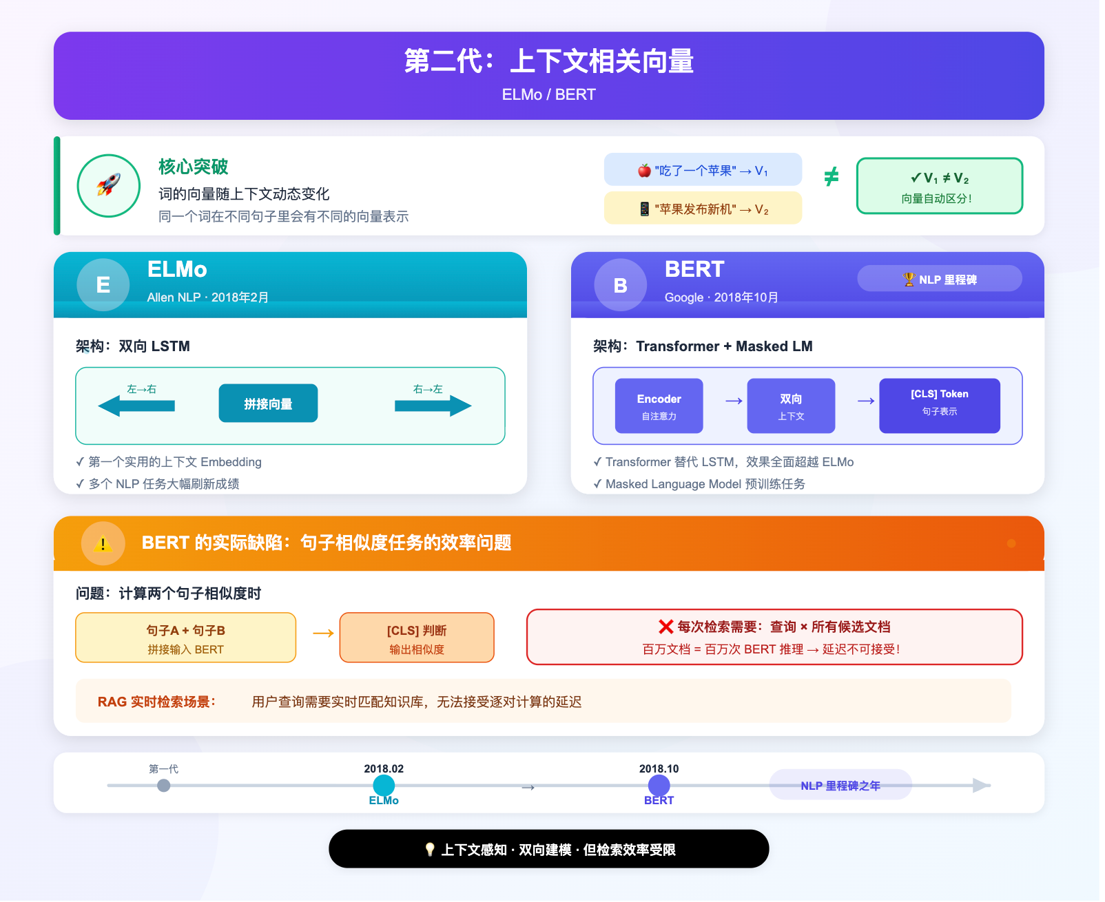 | 第二代 | ELMo、BERT | 上下文动态向量 | 检索时需两两拼接,速度极慢 | 不适用于实时检索 |