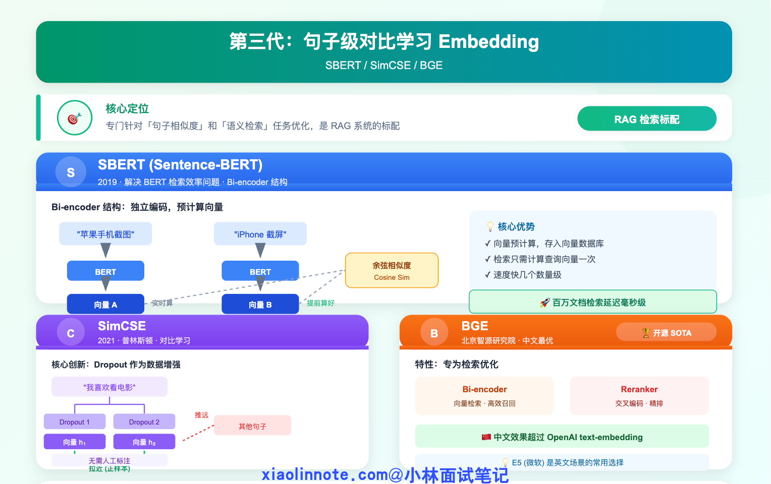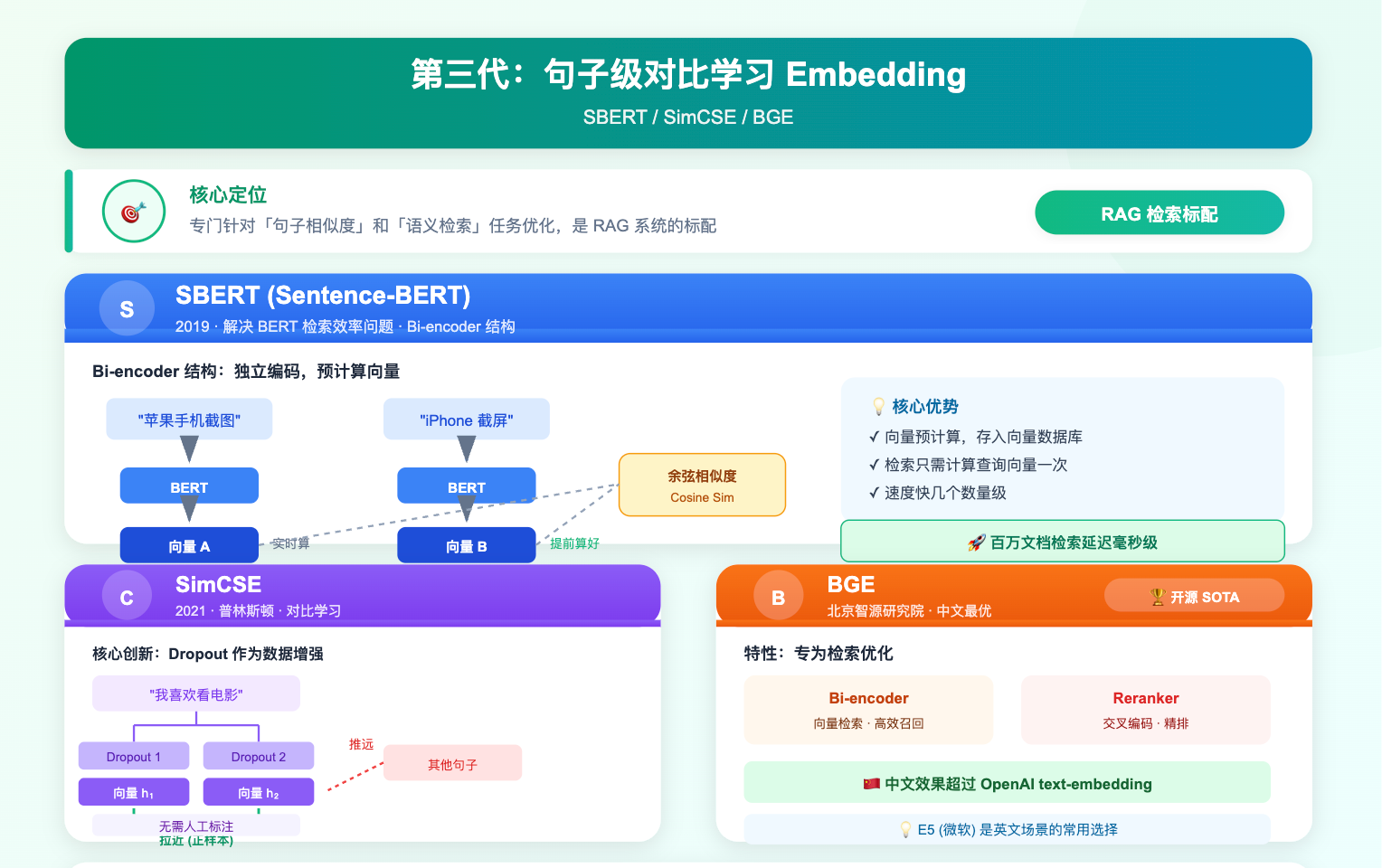 | 第三代 | SBERT、SimCSE、BGE、E5 | 句子级 bi-encoder,对比学习 | 精度低于 cross-encoder | 标配,性能和精度平衡最优 |