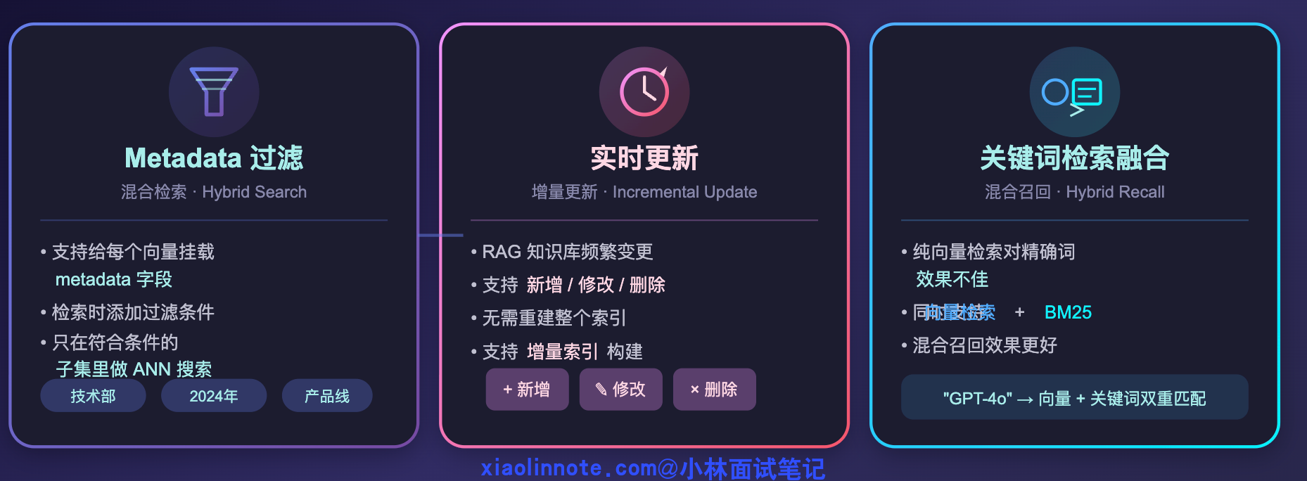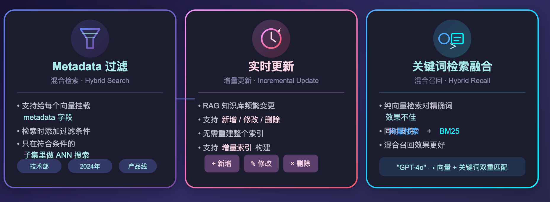 第三个是与关键词检索融合。纯向量检索对一些精确词语(比如产品型号「GPT-4o」、专有名词)的效果不好,有些向量数据库同时支持向量检索 + BM25 关键词检索,做混合召回效果更好。