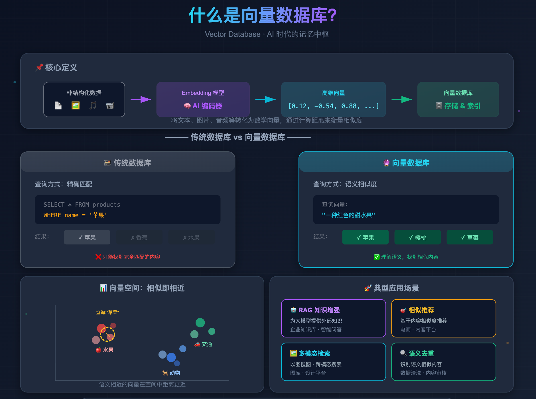 好吧,这段面试属实是把向量数据库的雷踩了个遍。下面我来从头捋清楚向量数据库到底是什么、为什么需要它、以及怎么做选型。