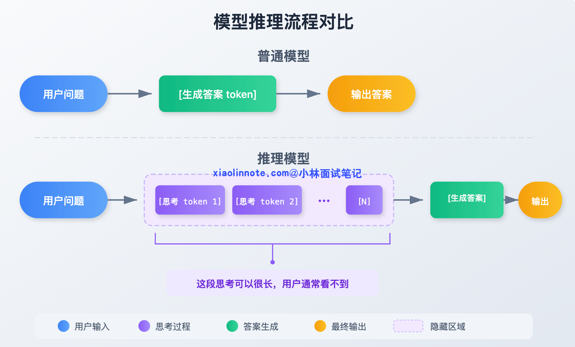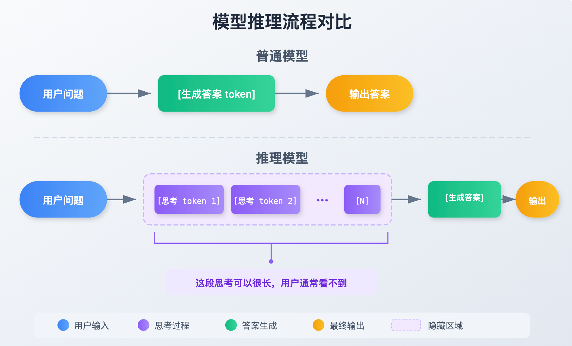 普通模型的工作方式很直接:问题进来,答案出去,收到输入就开始生成 token,一路生成到结束。