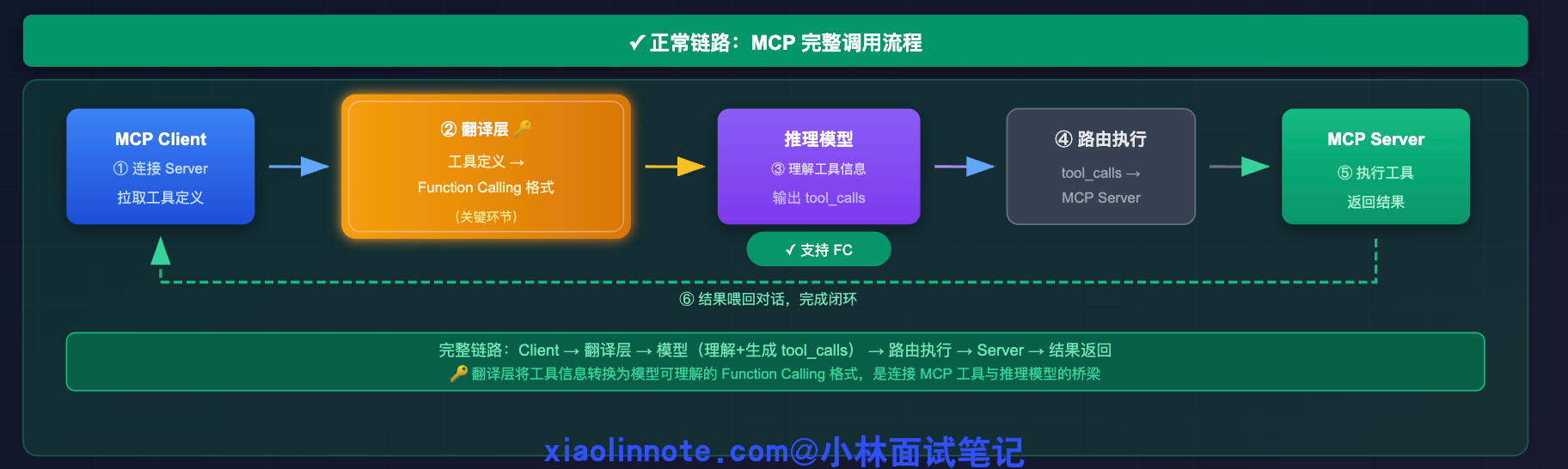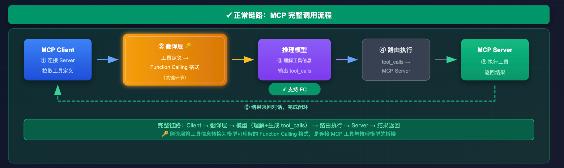 这个「工具定义 -> Function Calling 格式转换」就是 MCP 的翻译层,是整个链路的关键环节。