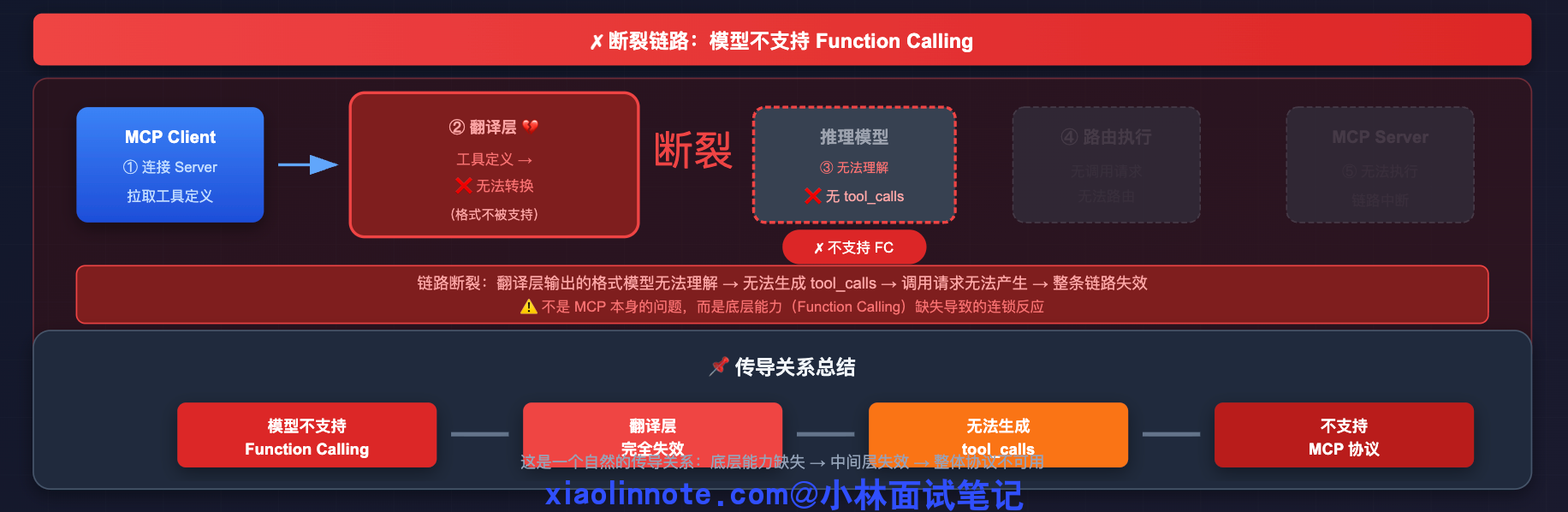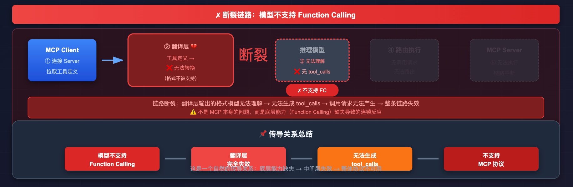 那如果推理模型不支持 Function Calling 呢?这个翻译层就完全失效了。工具信息没办法让模型理解,调用请求也无法被模型生成,整条链路从中间直接断掉了。