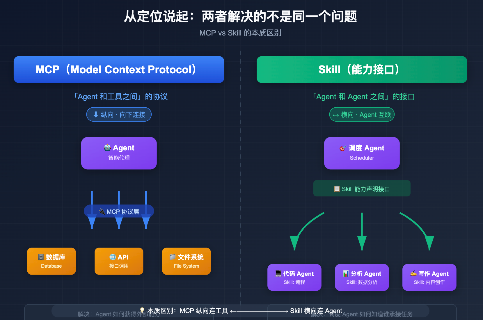 MCP 是「Agent 和工具之间」的协议,解决的是 Agent 怎么获得外部能力,比如查数据库、调 API、操作文件系统,它的作用方向是向下的,从 Agent 指向工具。而 Skill 是「Agent 和 Agent 之间」的接口,解决的是调度 Agent 怎么知道某个专业 Agent 能承接哪类任务,它的作用方向是横向的,发生在多个 Agent 之间。简单来说,一个是纵向连工具,一个是横向连 Agent,这就是两者最本质的区别。