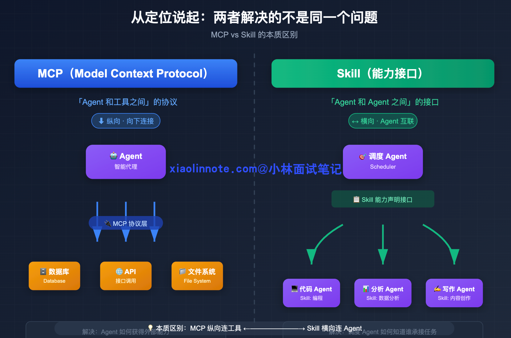 回到开头对话踩的雷,最大的误区就是把 MCP 和 Skill 当成「同一层次的不同实现」来对比。面试回答这道题,第一个必须点明的是两者的作用方向不同:MCP 是纵向的,连接 Agent 和工具,解决的是「Agent 怎么获得外部能力」;Skill 是横向的,连接 Agent 和 Agent,解决的是「任务怎么路由到对的 Agent」。