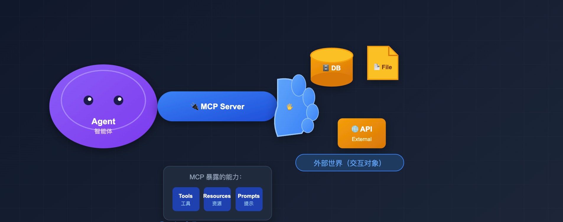 理解了两者的定位差异,咱们分别展开看看。先说 MCP,为什么说它是 Agent 的「手」?因为如果没有 MCP,Agent 就只会「说话」,不会「做事」。MCP Server 暴露的 Tools、Resources、Prompts 就是 Agent 使用外部能力的手段,模型通过 Function Calling 触发这些工具,工具执行完把结果喂回对话。你可以把 MCP 理解成给 Agent 装上了一双手,让它能够真正去操作外部世界,查数据库、读文件、调 API,而不仅仅是在对话框里跟你聊天。