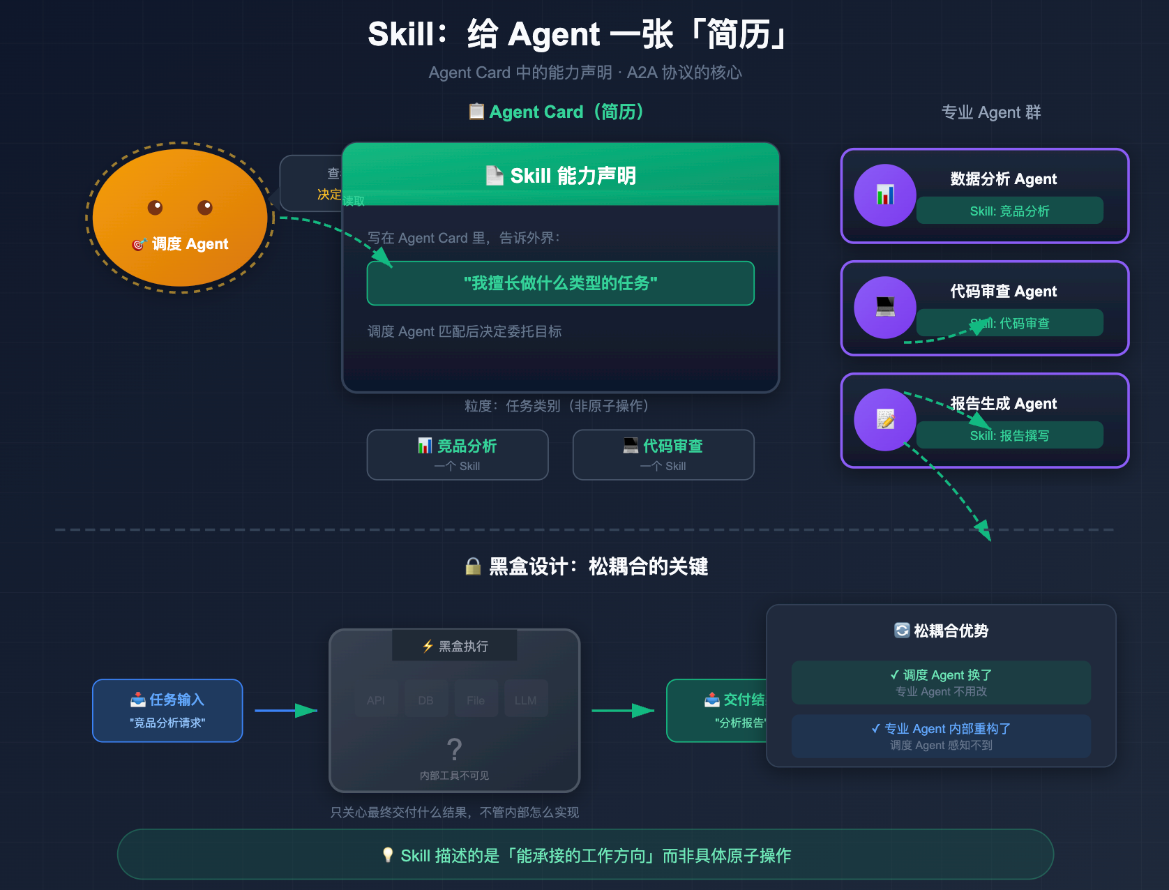 Skill 的粒度是「任务类别」:「竞品分析」是一个 Skill,「代码审查」是一个 Skill,描述的是 Agent 能承接的工作方向,而不是具体的原子操作。调用方不知道、也不需要知道 Agent 内部用了哪些工具来完成任务,执行过程完全黑盒,只关心最后交付什么结果。这种黑盒设计正是多 Agent 系统能保持松耦合的关键,调度 Agent 换了,专业 Agent 不用改;专业 Agent 内部重构了,调度 Agent 也感知不到。