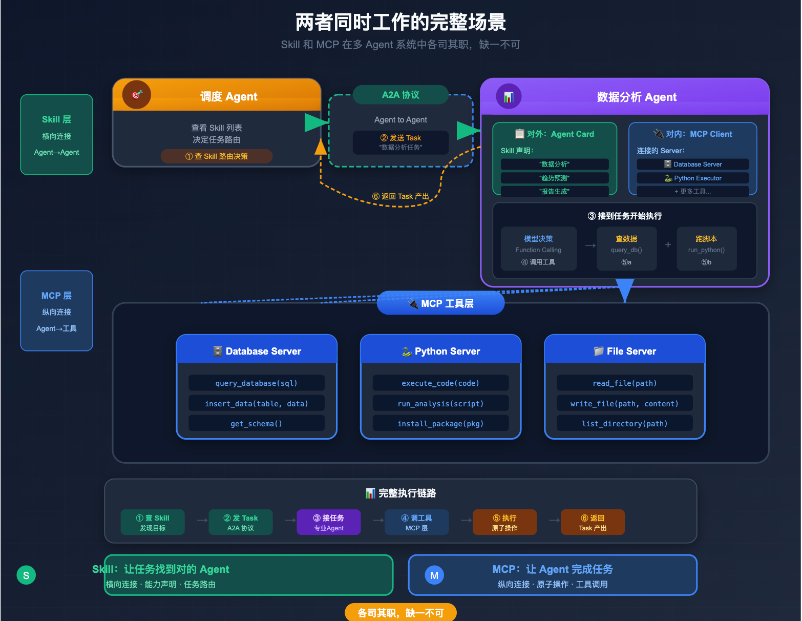 对外,这个 Agent 在 Agent Card 里声明了自己的 Skill:["数据分析", "趋势预测", "报告生成"],这就是它的「简历」,调度 Agent 看到这些 Skill,就知道数据类的任务应该交给它。对内呢,它的 MCP Client 连着数据库 Server 和 Python 执行器 Server,这就是它的「手」,模型在执行任务时通过 Function Calling 调用这些工具来真正完成数据处理。