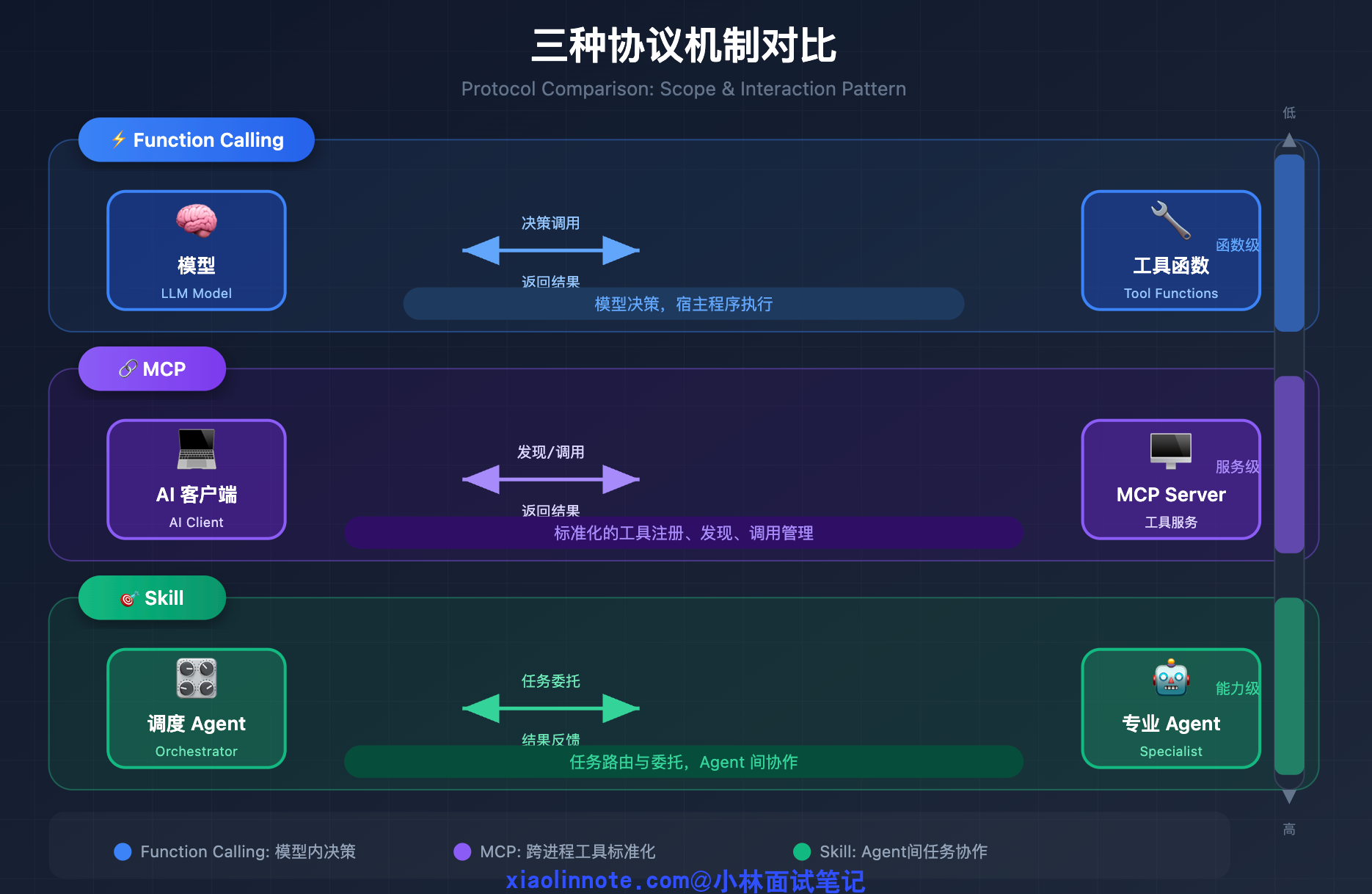 👔面试官:你前半段说的方向沾边了,但关键问题是你没搞清楚这三者的层级依赖。它们不是并列的三个方案,而是从底到顶的三层架构:Function Calling 是最底层的调用协议,MCP 在它之上做工具管理,Skill 在最上层做任务路由。你把「谁和谁通信」「发生在哪两个角色之间」这些搞清楚,三者的区别就一目了然了。