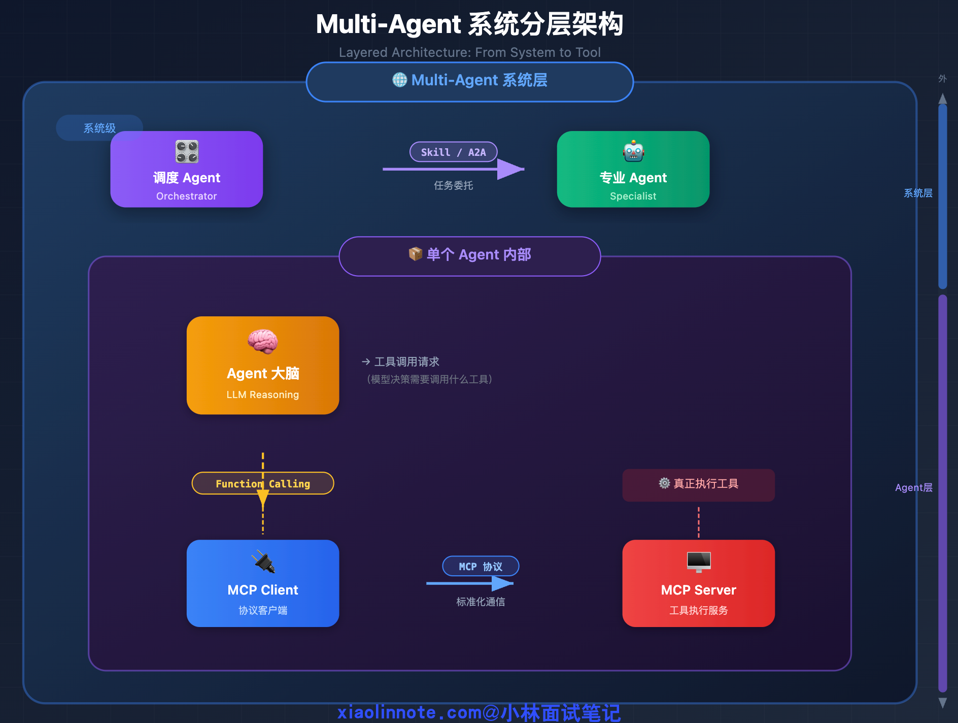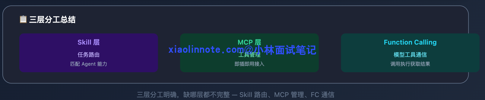 面试时如果能用一个完整场景把三层串起来就更好了:调度 Agent 根据 Skill 把任务路由给专业 Agent,专业 Agent 通过 MCP 发现可用工具,模型通过 Function Calling 触发具体的工具调用。这样面试官能看出你不只是背了概念,而是真正理解了三者在系统里怎么协作的。