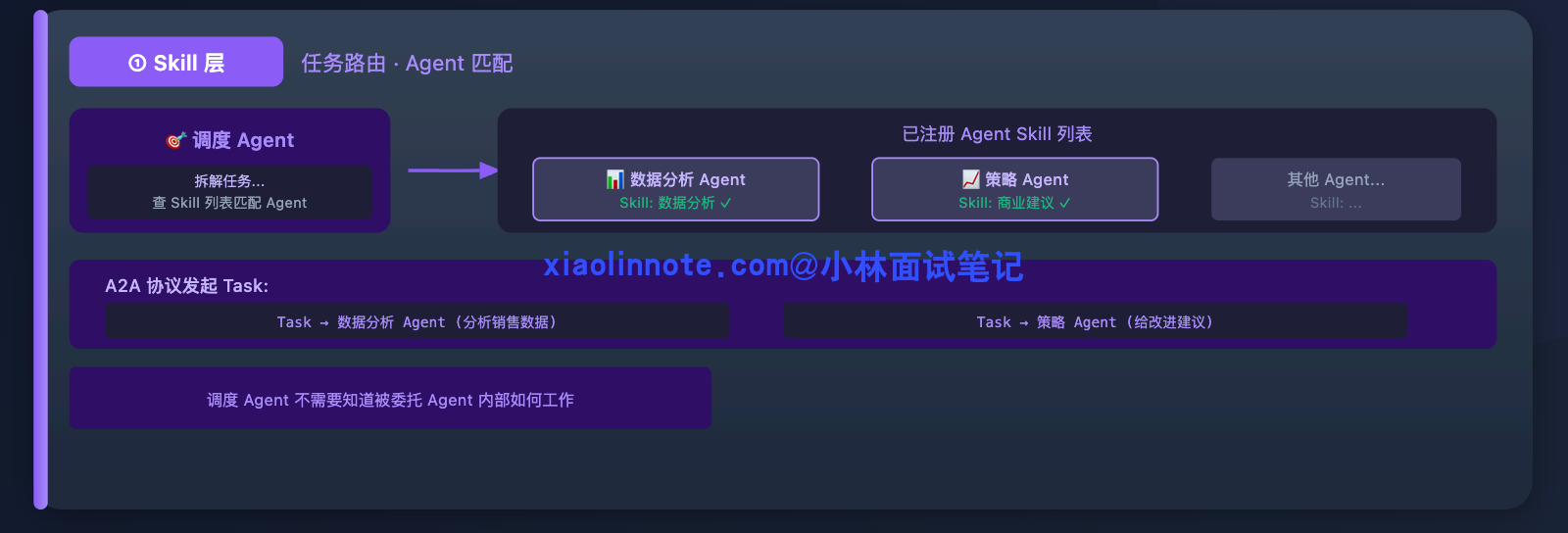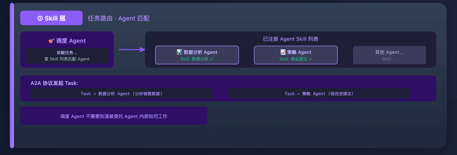 首先是 Skill 层在起作用:调度 Agent 拆解任务,发现需要「数据分析」和「商业建议」两类能力。它去查已注册 Agent 的 Skill 列表,匹配到数据分析 Agent(声明了「数据分析」Skill)和策略 Agent(声明了「商业建议」Skill),通过 A2A 协议分别发起 Task,把任务委托出去。调度 Agent 不需要知道这两个 Agent 内部怎么工作,只管任务路由。