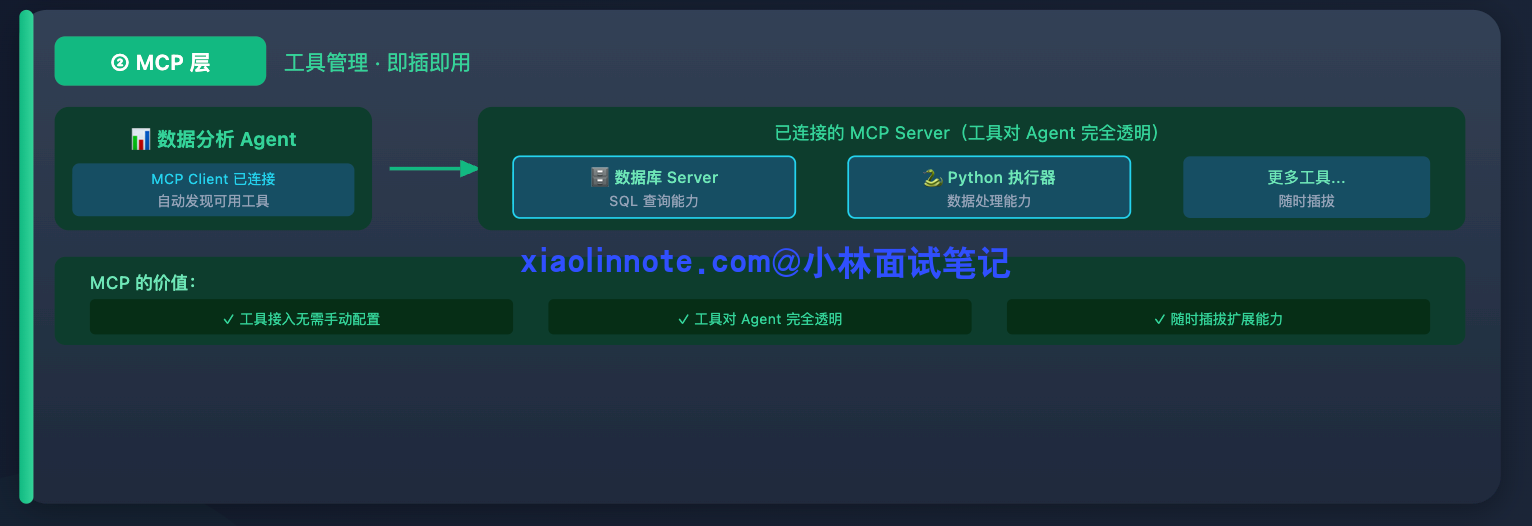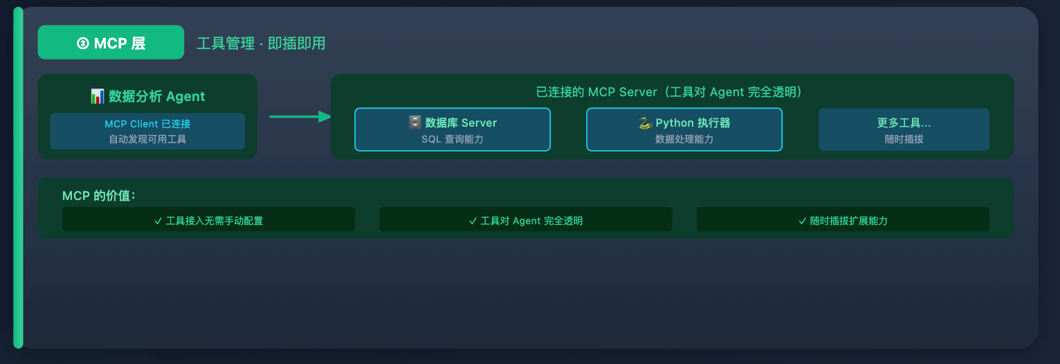 然后是 MCP 层在起作用:数据分析 Agent 收到任务开始执行,它的 MCP Client 已经连上了数据库 MCP Server 和 Python 执行器 MCP Server,自动知道这两个工具可用,不需要任何手动配置。这是 MCP 的价值所在,工具的接入对 Agent 完全透明,随时插拔。