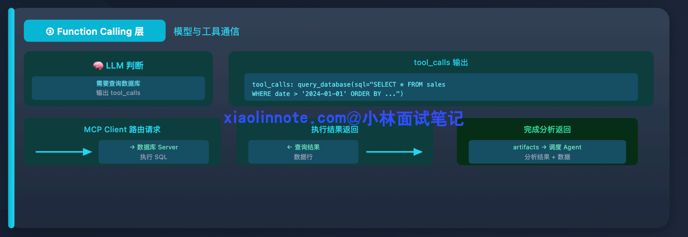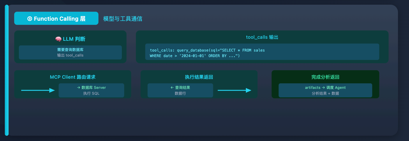 最底层是 Function Calling 在起作用:数据分析 Agent 里的 LLM 判断需要查数据库,输出 tool_calls: query_database(sql="SELECT ..."),MCP Client 把这个请求路由到数据库 Server 执行,拿到结果继续处理,完成分析后把结果通过 A2A Task 的 artifacts 返回给调度 Agent。
