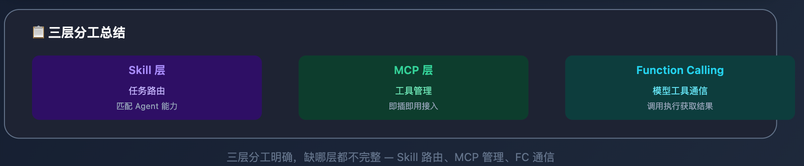 整个流程里 Skill 做路由、MCP 做工具管理、Function Calling 做模型和工具的通信,三层分工明确,缺哪层都不完整。