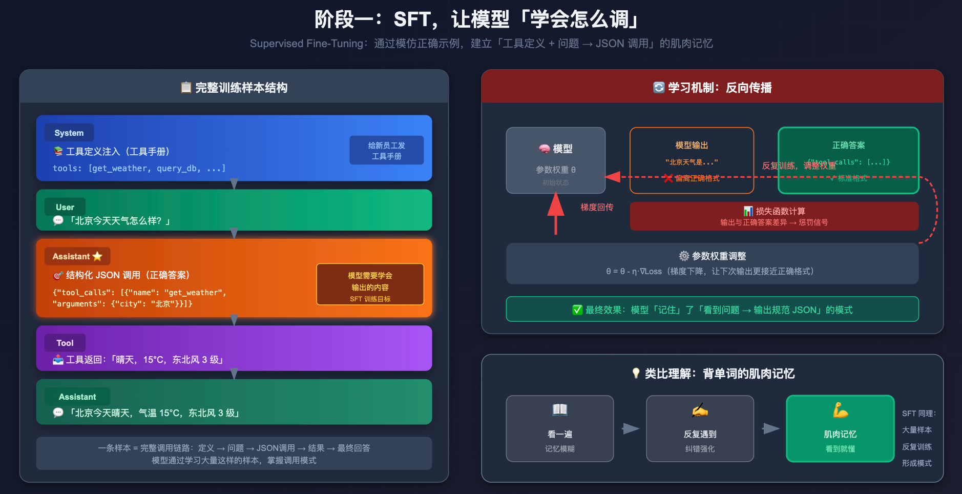这套完整的对话结构覆盖了整个调用链路。模型通过反向传播(backpropagation)来学习:给定样本里的正确 JSON 调用,当模型输出的内容偏离这个正确答案时,损失函数就会产生惩罚信号,梯度往回传,一点点调整模型内部的参数权重,让下次输出更接近正确格式。
