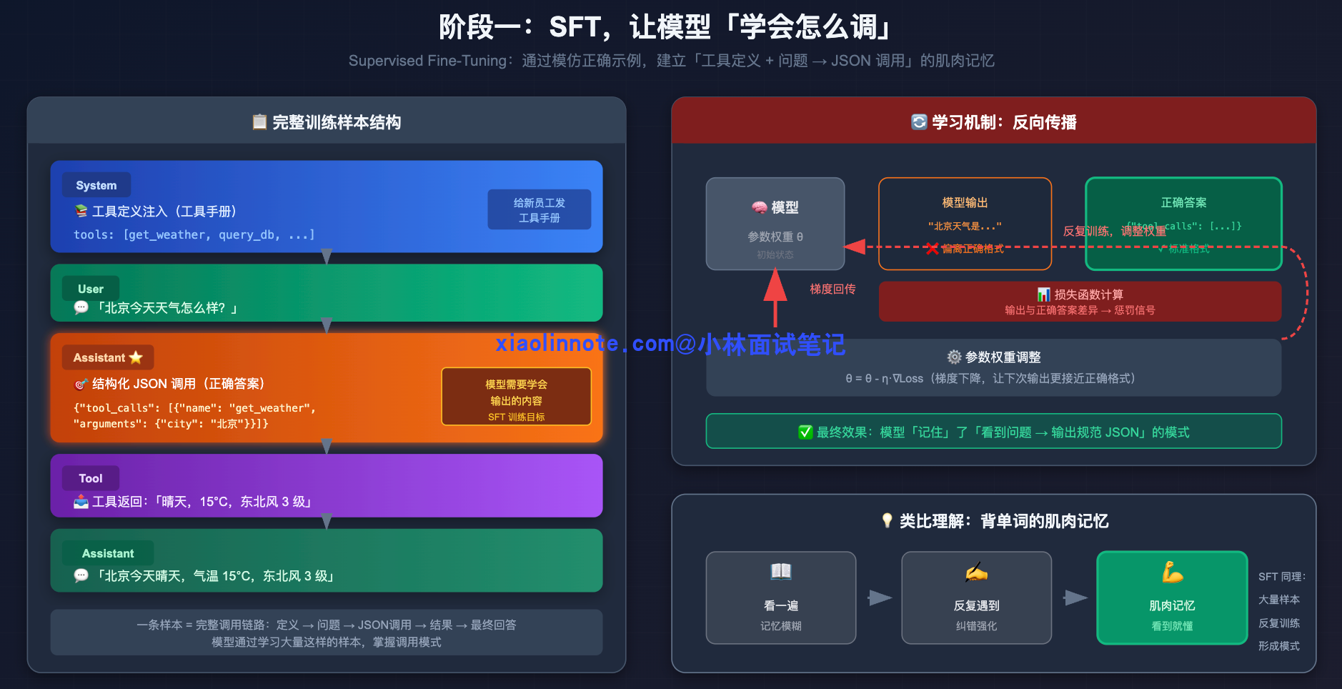 面试回答这道题,要把两个训练阶段讲清楚:SFT 阶段通过「system 工具定义 + user 问题 + assistant JSON 调用 + tool 执行结果 + assistant 最终回答」这样的完整对话样本来训练,让模型通过反向传播学会整套流程;RLHF 阶段通过人类对多种回答的偏好排序训练奖励模型,再用 PPO 等强化学习算法调整主模型,建立「该不该调」的边界感。训练数据来源也要提到:人工标注质量高但成本高用于种子数据,模型自动生成(Self-Instruct / Distillation)成本低量大但要注意幻觉传递的风险。一句话总结:SFT 教会怎么调,RLHF 教会什么时候调。