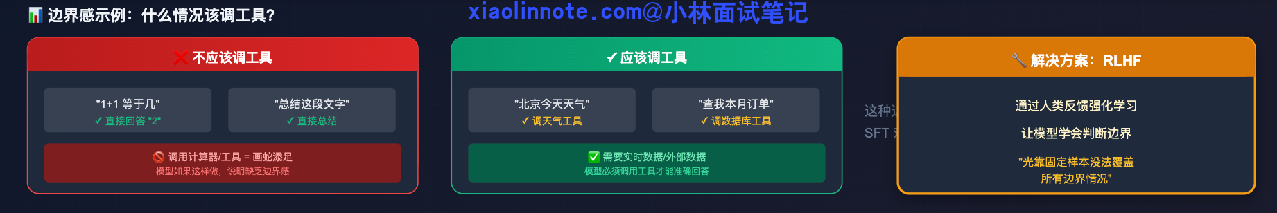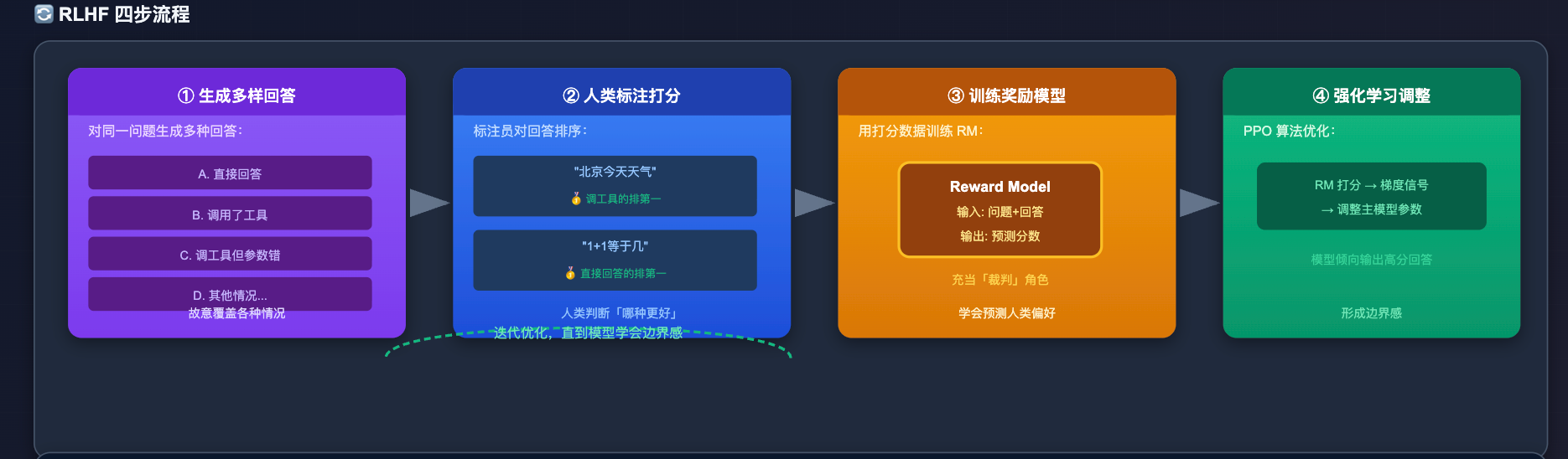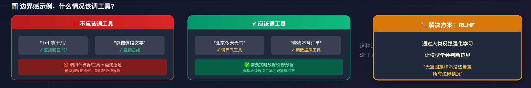 这种「能直接回答就直接回答,需要外部数据才去调」的边界感,SFT 很难教好,因为光靠固定的正确样本没法覆盖所有边界情况。RLHF 就是来解决这个问题的。