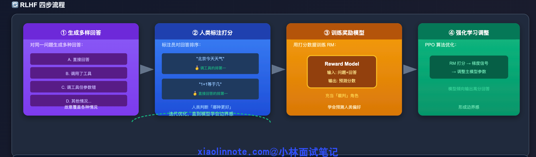 RLHF(Reinforcement Learning from Human Feedback,人类反馈强化学习)的流程分四步。