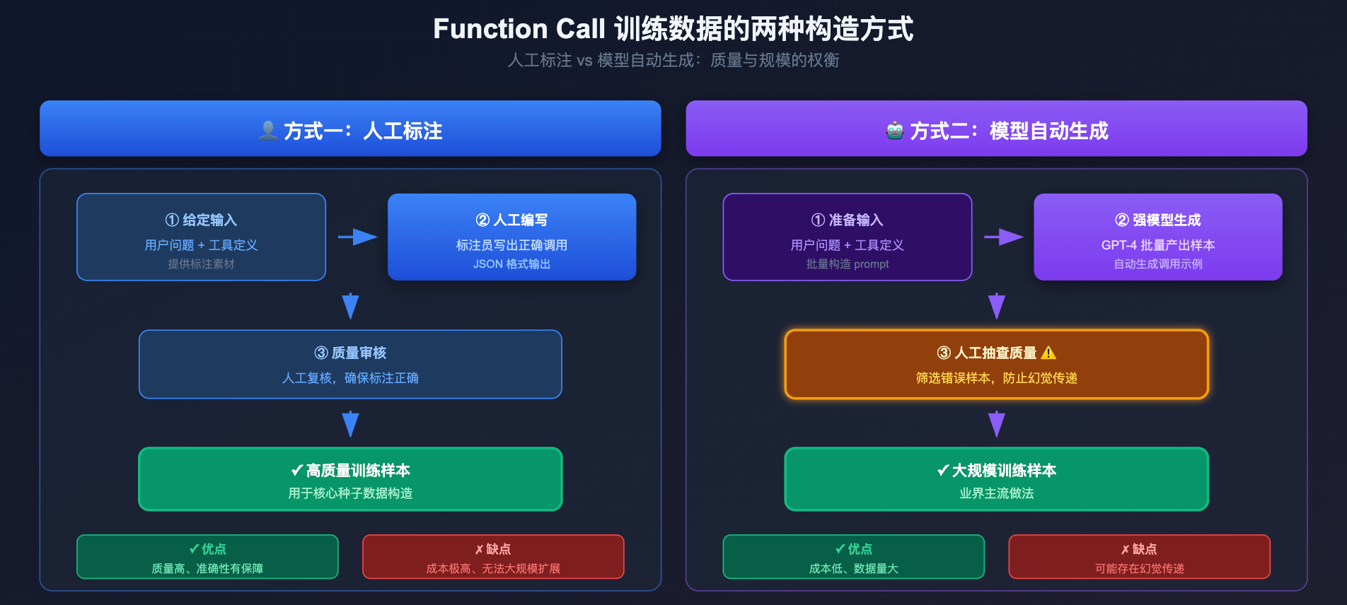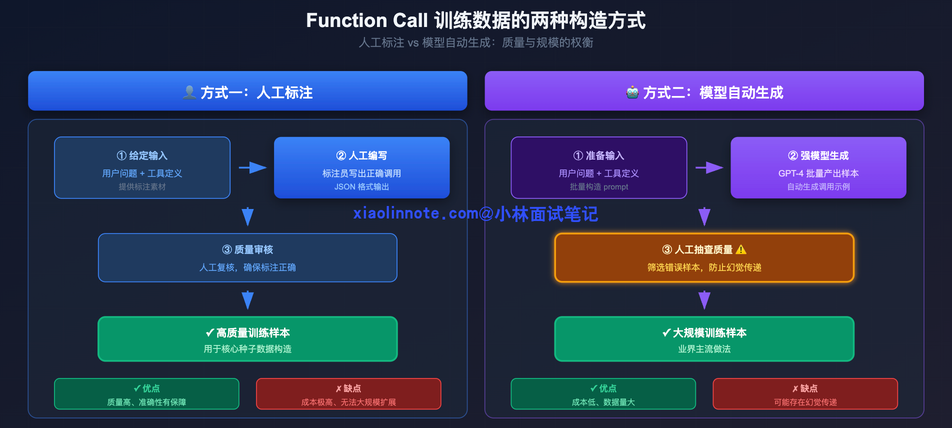 第一种是人工标注,雇标注员,给定用户问题和工具定义,让他们写出正确的调用示例。这种方式质量好,因为人写的样本准确度有保障,但成本极高,通常只用于核心种子数据的构造,没法大规模扩展。