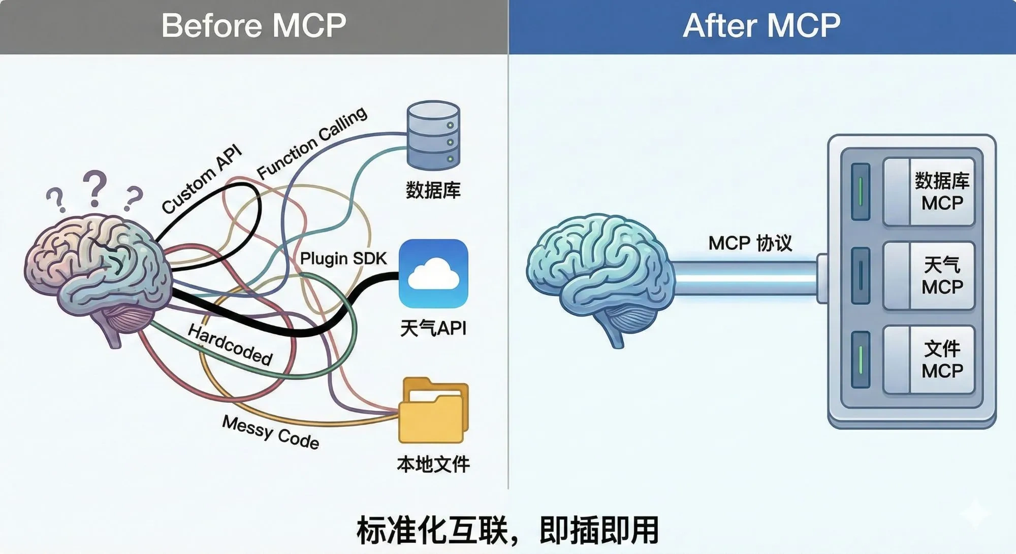 这就是 MCP 出现之前,AI 工具生态的真实状态:碎片化、难复用、强绑定。每个工具、每个模型都是一座孤岛,接一个新工具就要重新搭一座桥。