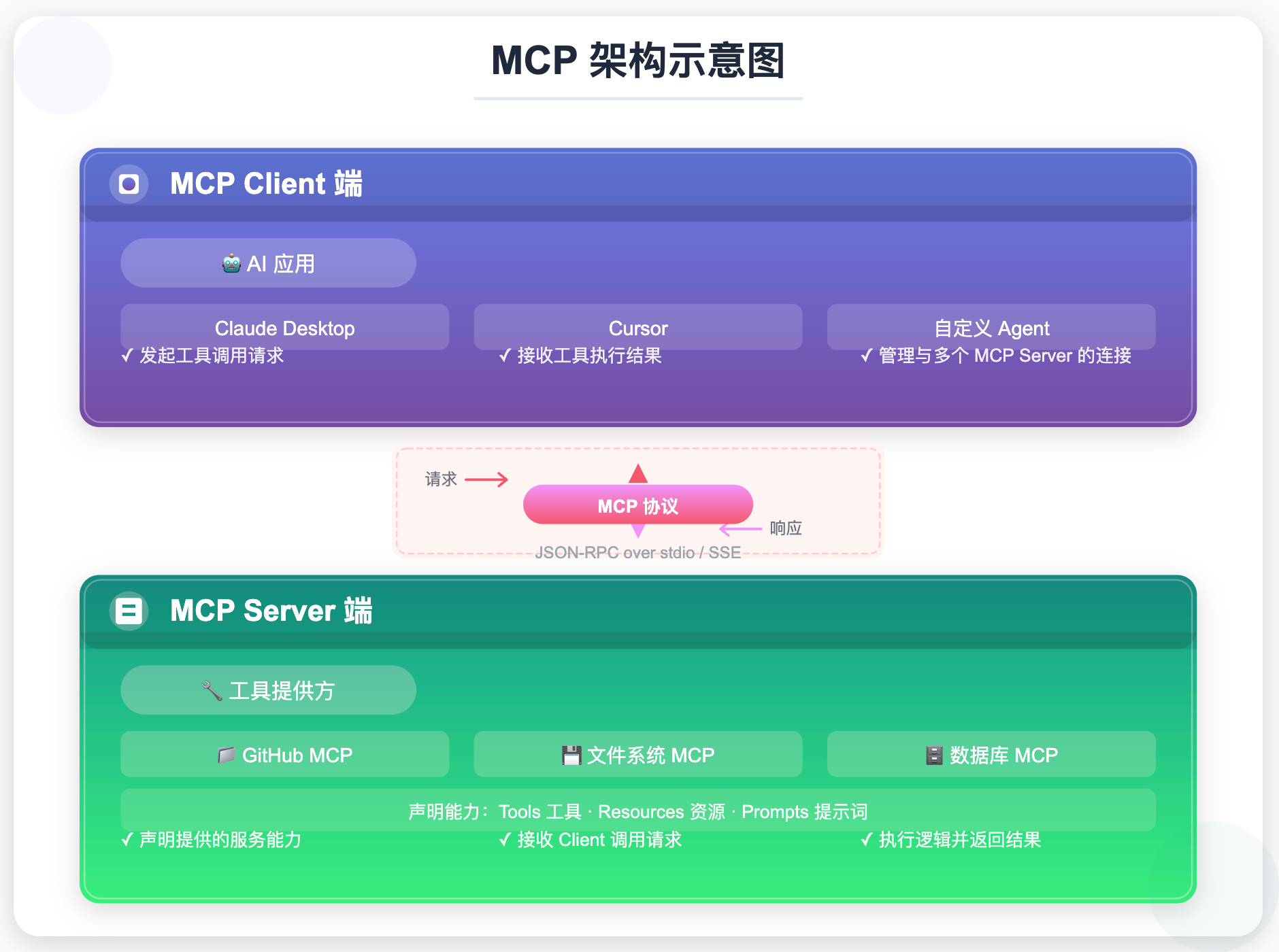 MCP 做的是同一件事:为「AI 接工具」这件事定了一套统一的协议标准。工具提供方(比如 GitHub 官方)按 MCP 规范实现一个 MCP Server,里面封装好各种操作。任何支持 MCP 的 AI 客户端,Claude Desktop、Cursor、各种 Agent 框架,都能直接连上这个 Server,自动发现里面的工具并使用,不需要写任何定制化对接代码。工具只需要实现一次,到处复用。