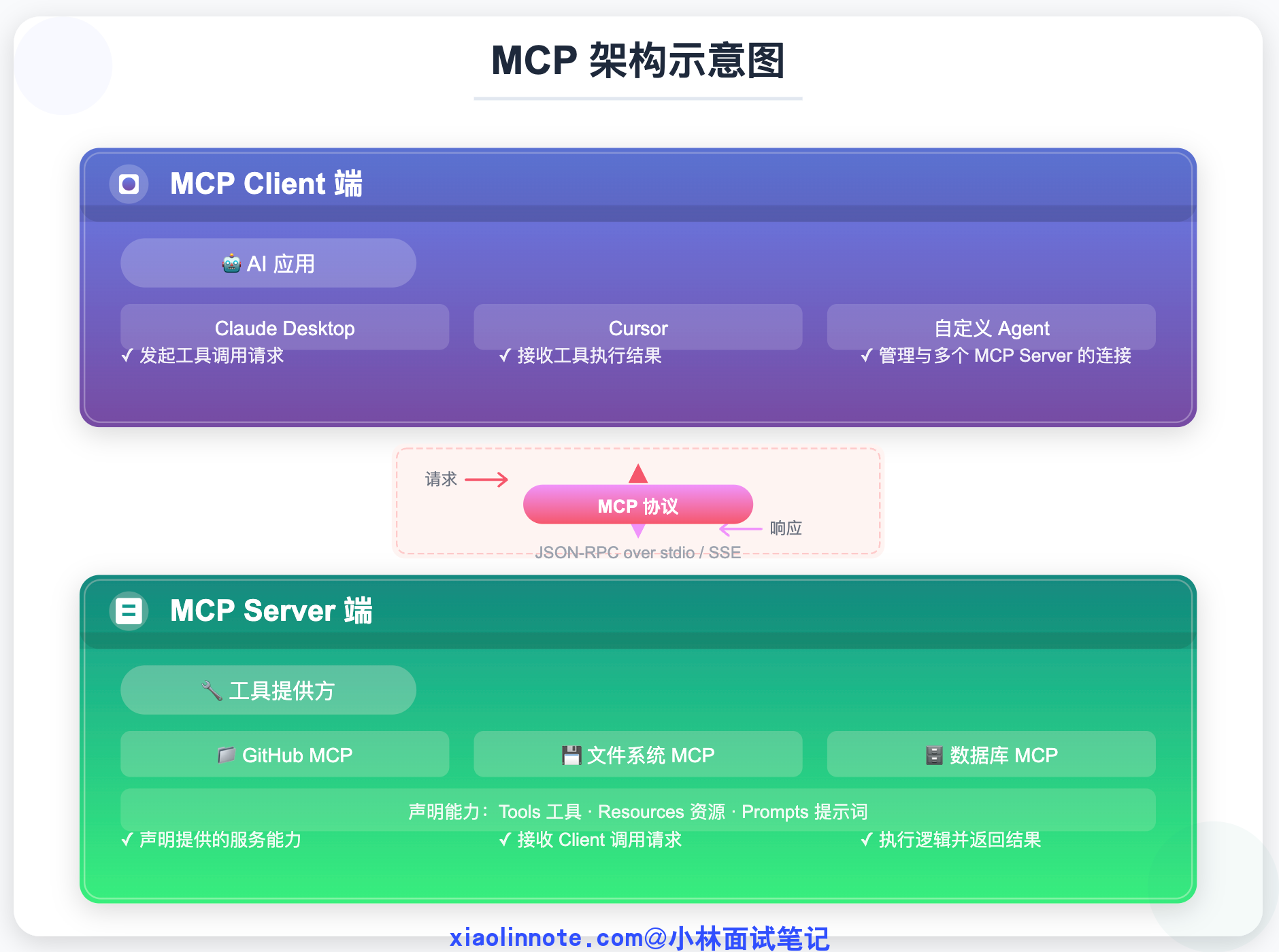 👔面试官:MCP 是开放协议,不是只给 Claude 用的。它解决的是工具接入碎片化的问题,工具实现一次、到处复用,任何支持 MCP 的客户端都能接入。Client-Server 架构、三类核心能力 Tools/Resources/Prompts 的区别、底层 JSON-RPC 通信机制,这些核心内容你一个都没提到,回去补课吧。