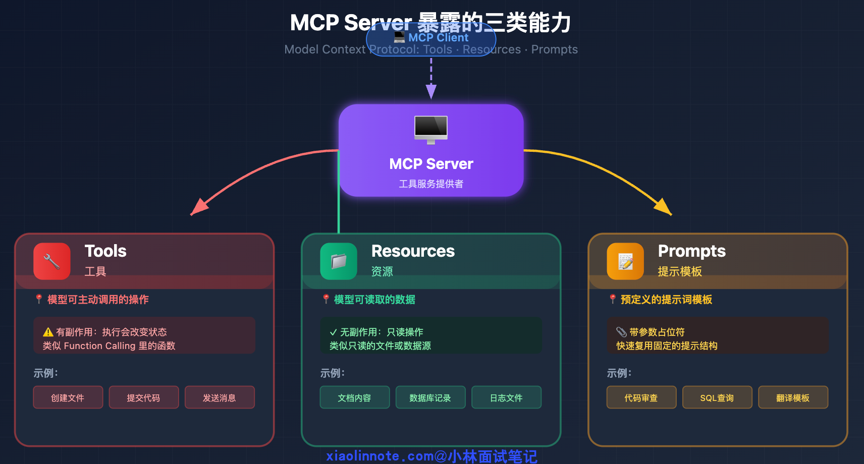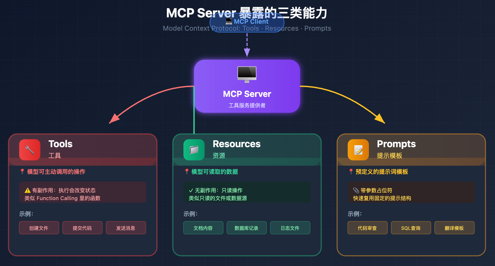 MCP Server 可以向 Client 暴露三类能力,各有各的定位。