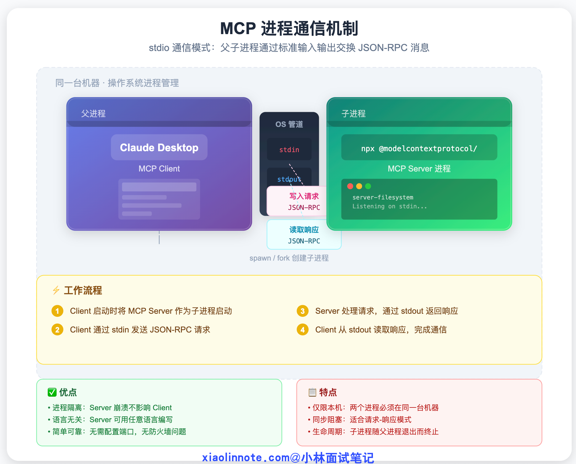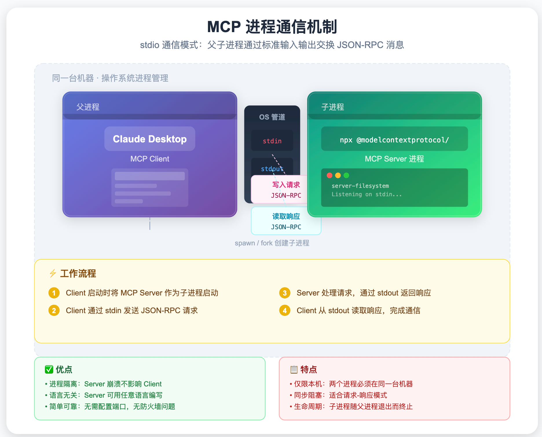 工作原理:MCP Client(比如 Claude Desktop)在启动时,把 MCP Server 当作一个子进程启动,然后通过进程的标准输入(stdin)发送请求、从标准输出(stdout)读取响应。两个进程在同一台机器上运行,通过操作系统的管道通信。