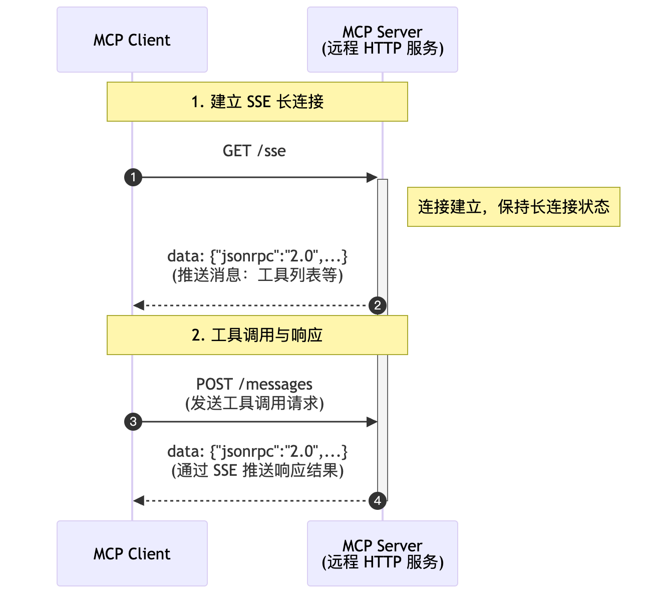 SSE 适合远程部署的场景,Server 作为独立的 HTTP 服务运行,Client 通过网络连接访问。