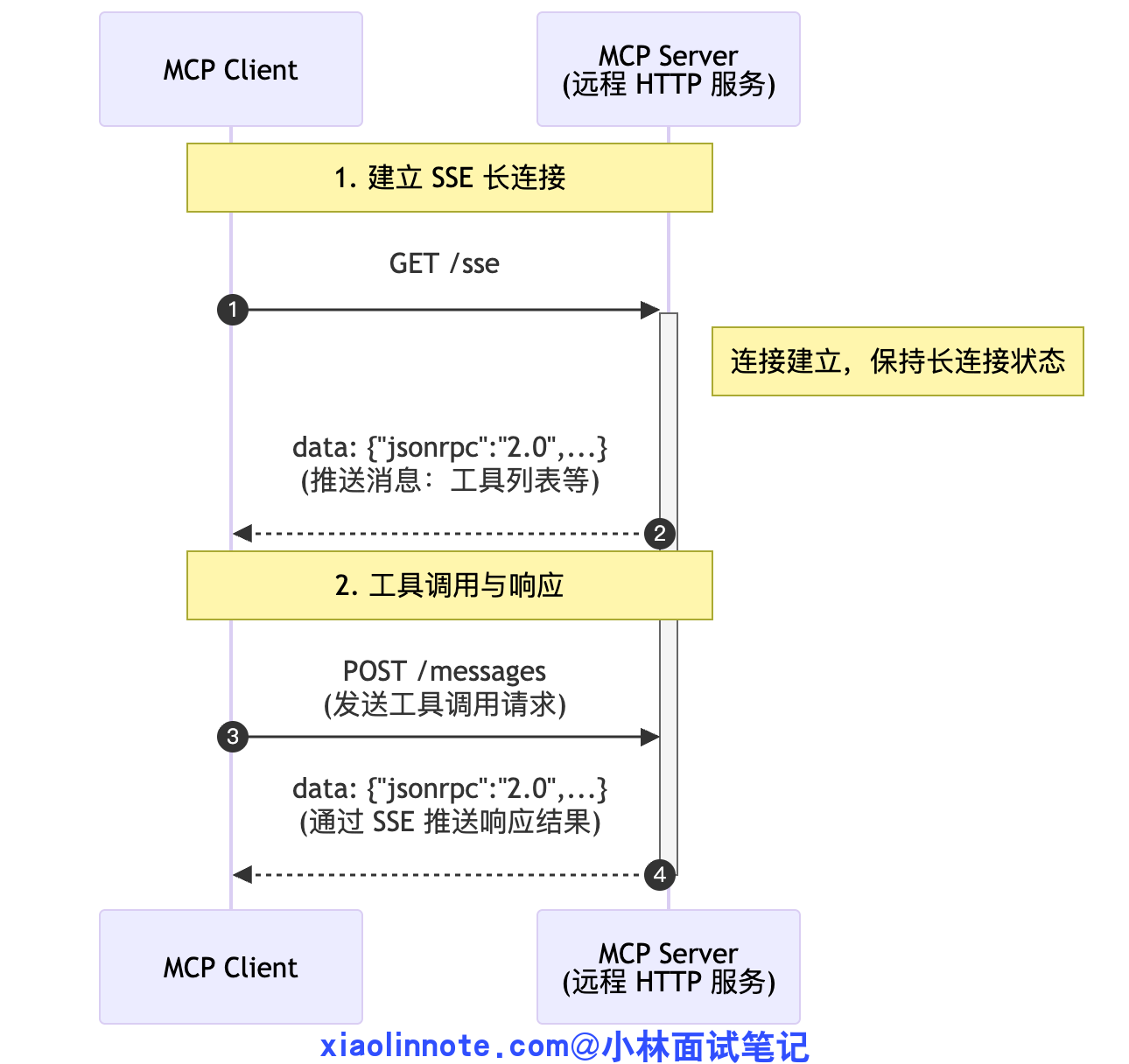 }JSON-RPC 本身只定义消息格式,不关心底层怎么传输,MCP 在此基础上定义了两种传输层实现。