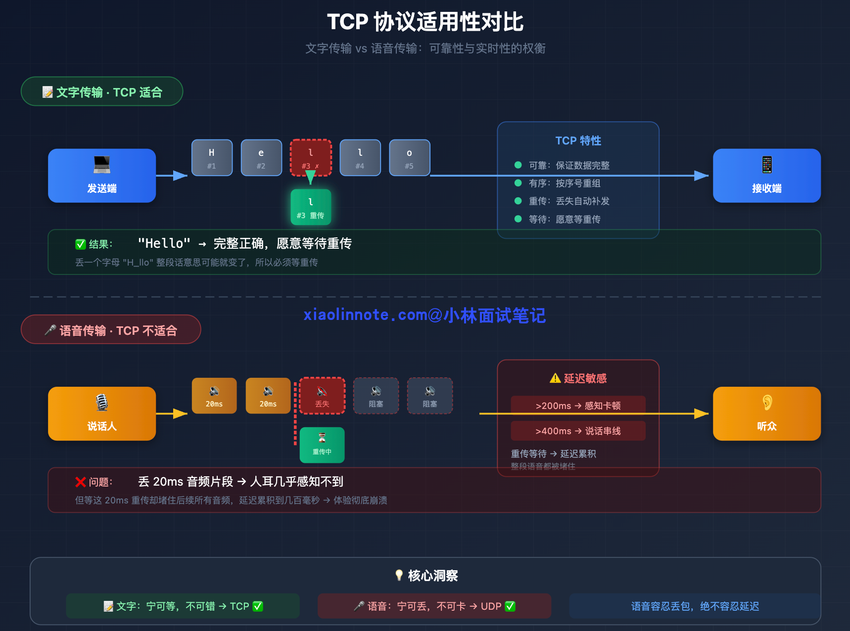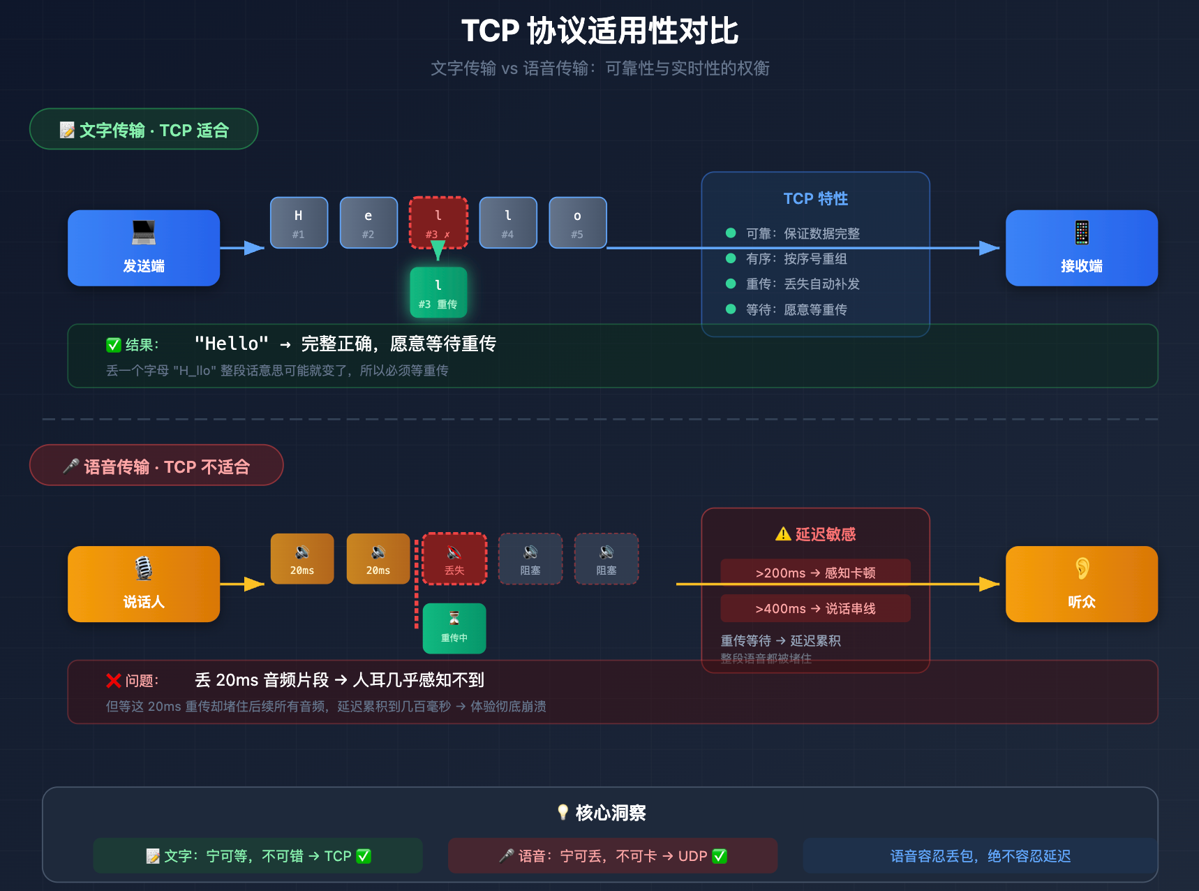 传输语音时,情况完全反过来。人类大脑对语音时序极其敏感,当两个人对话时,超过 200ms 的延迟就会让人明显感觉到「卡顿」,超过 400ms 就会开始出现「说话串线」的尴尬:你以为对方说完了开口说话,结果对方话还没说完。在这个场景里,丢掉一个 20ms 的音频小片段不是什么大事,人耳感知不到一小段静音;但为了等这 20ms 的片段重传,把后续所有音频都堵住,延迟积累到几百毫秒,体验就彻底崩了。语音容忍丢包,绝不容忍延迟,TCP 的设计哲学正好和这个需求相反。
