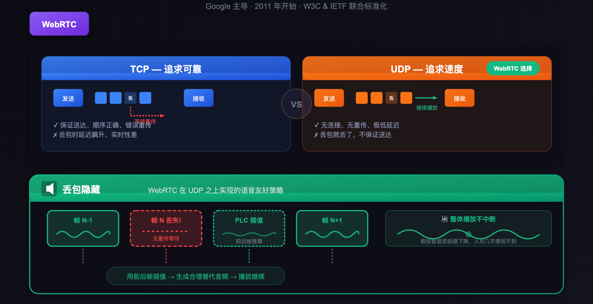 回到开头踩的雷,最大的误区是觉得 WebSocket 和 WebRTC「都能传语音,差别不大」。面试回答这道题,第一个必须说到的核心点是底层协议的区别:WebSocket 基于 TCP,WebRTC 基于 UDP。TCP 丢包强制重传,后续数据全部等待,延迟不可控;UDP 不重传,WebRTC 用丢包隐藏技术(插值填补)处理丢失的音频帧,用微小的音质损失换取稳定的低延迟。语音场景的铁律是「容忍丢包,绝不容忍延迟」,TCP 的设计哲学和这个需求正好相反。